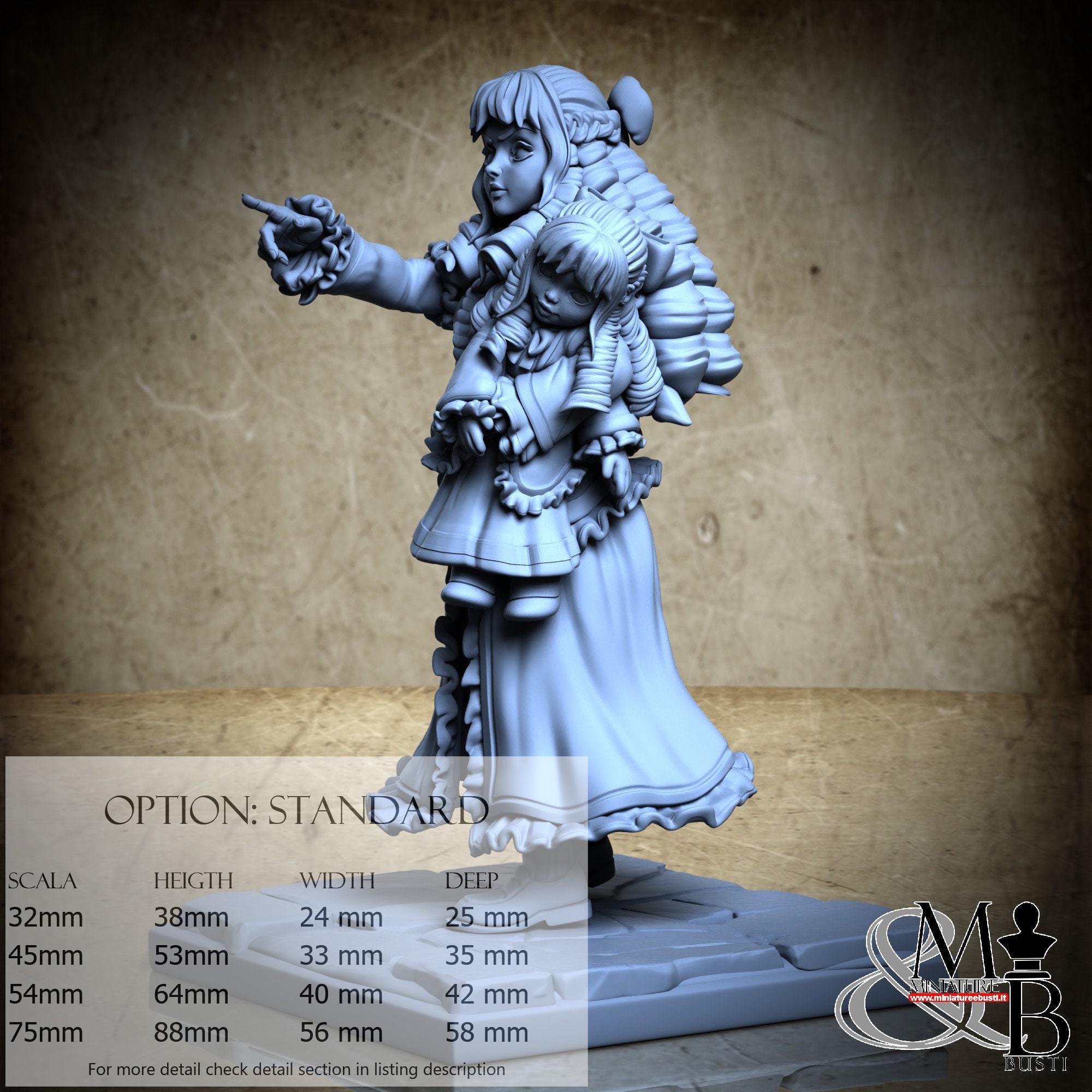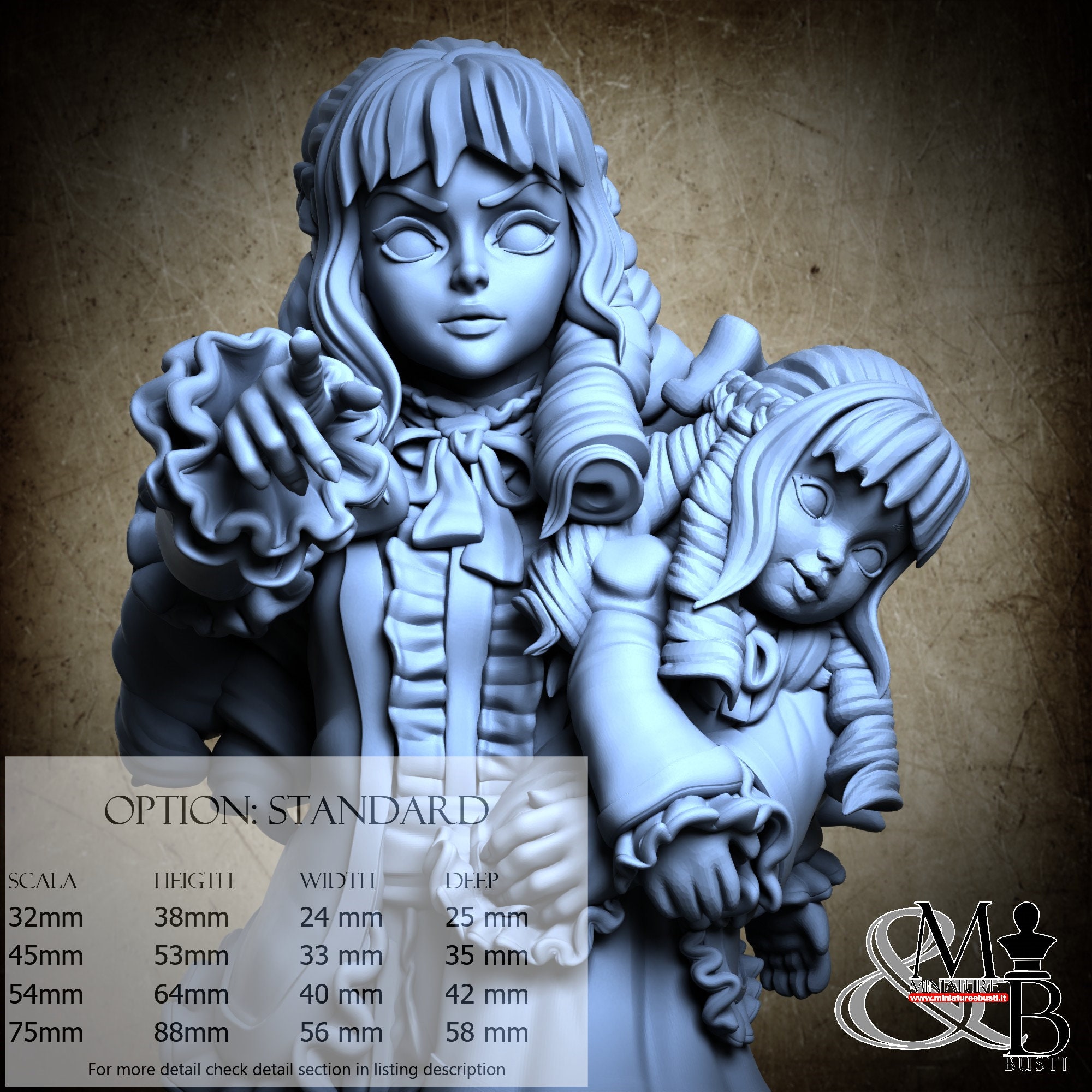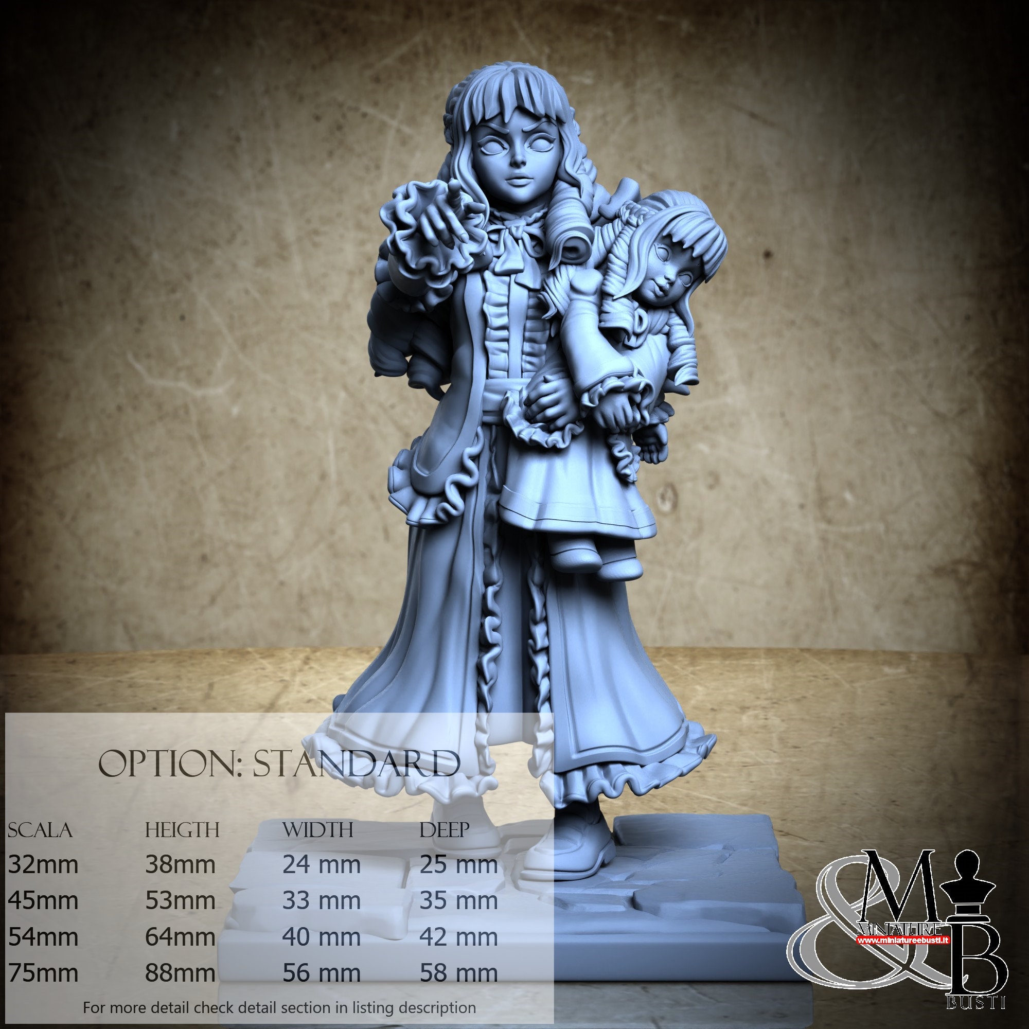 - Figure (1 piece) in Resin: Height: 35 mm, Width: 18 mm, Depth: 21 mm
