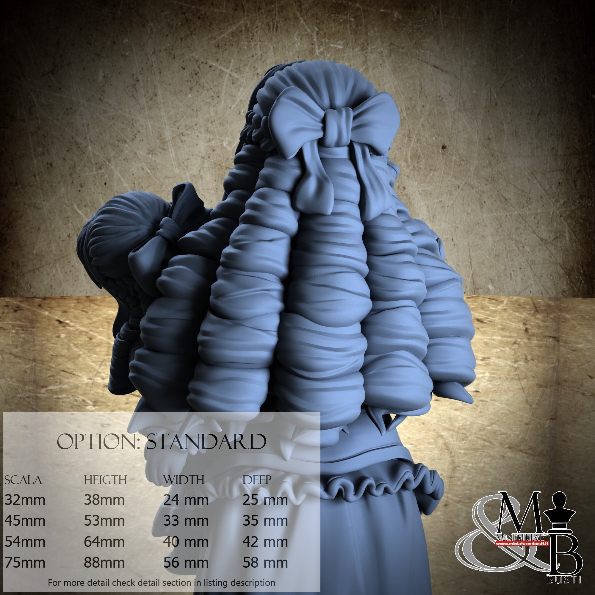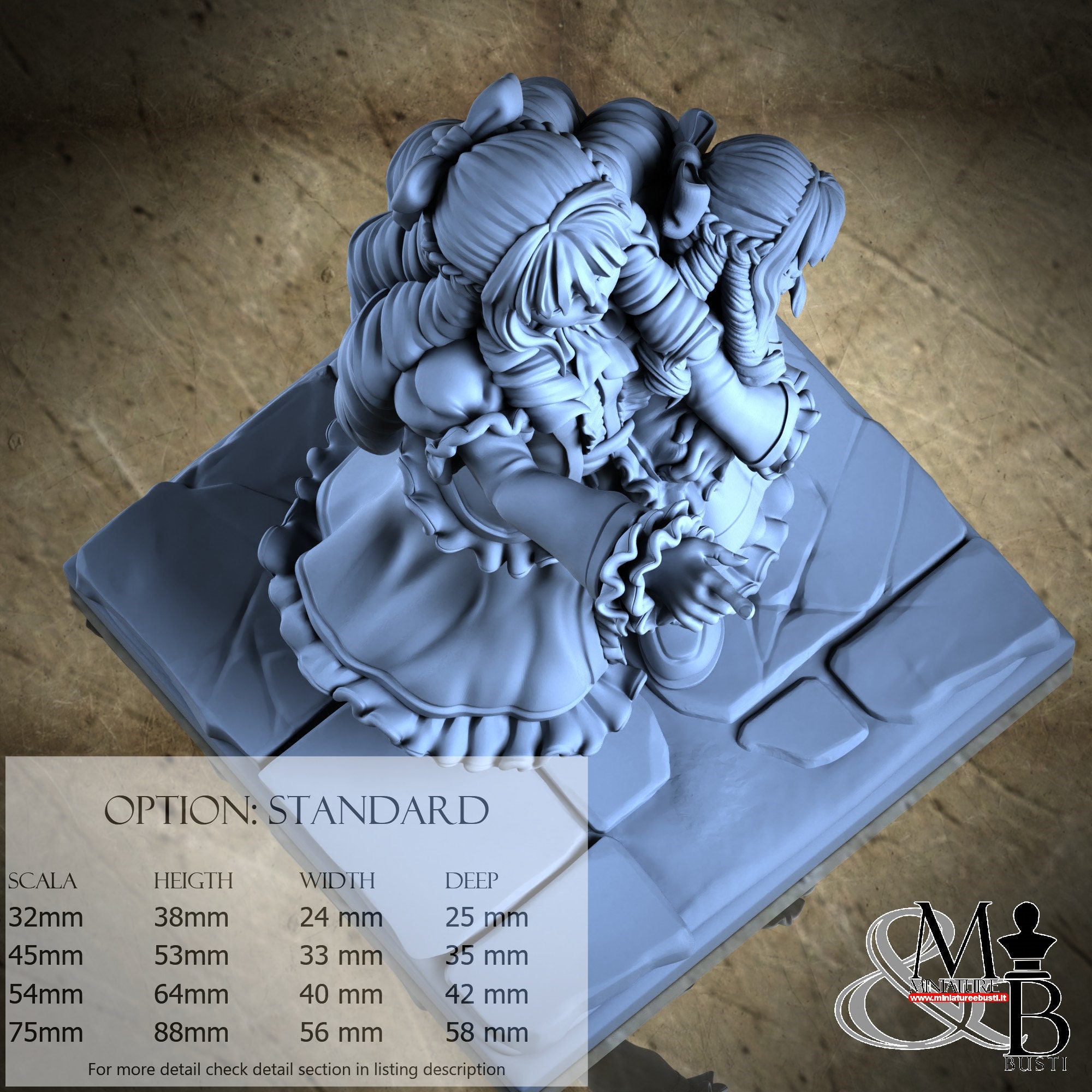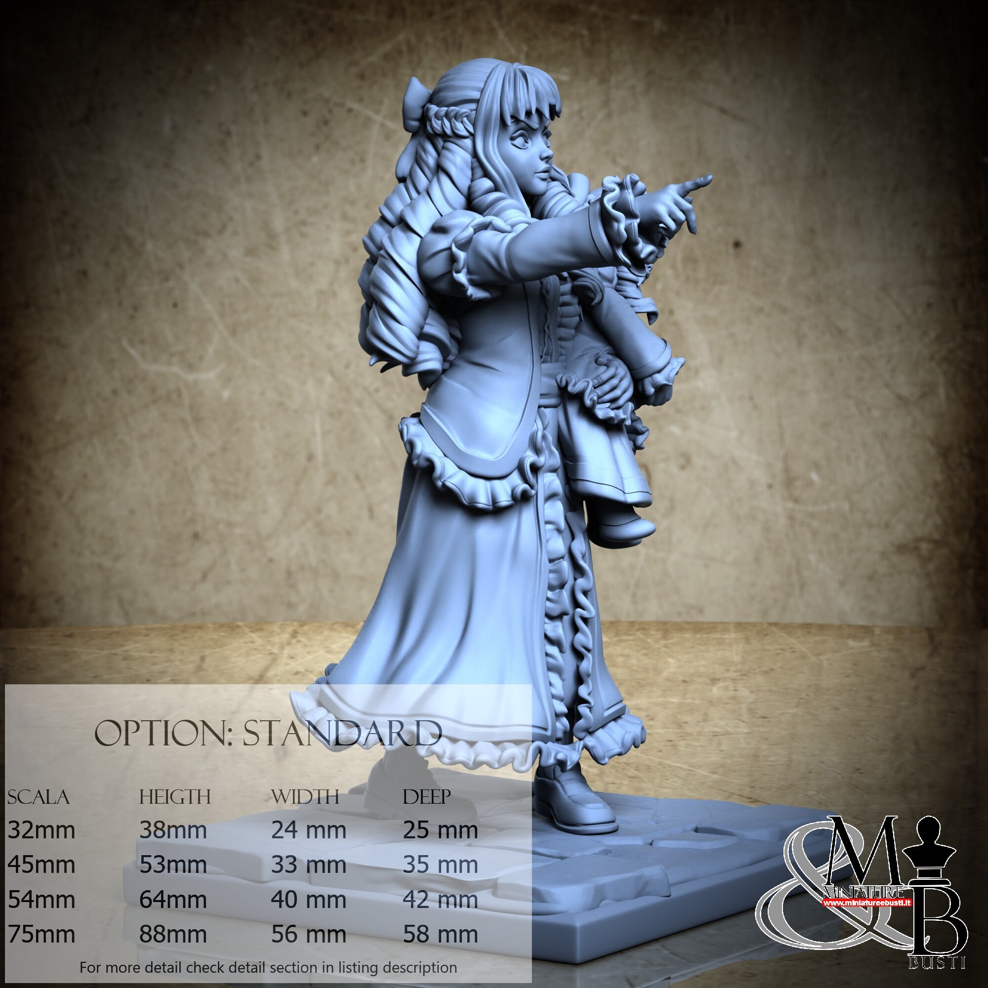- Figure (1 piece) in Resin: Height: 35 mm, Width: 18 mm, Depth: 21 mm