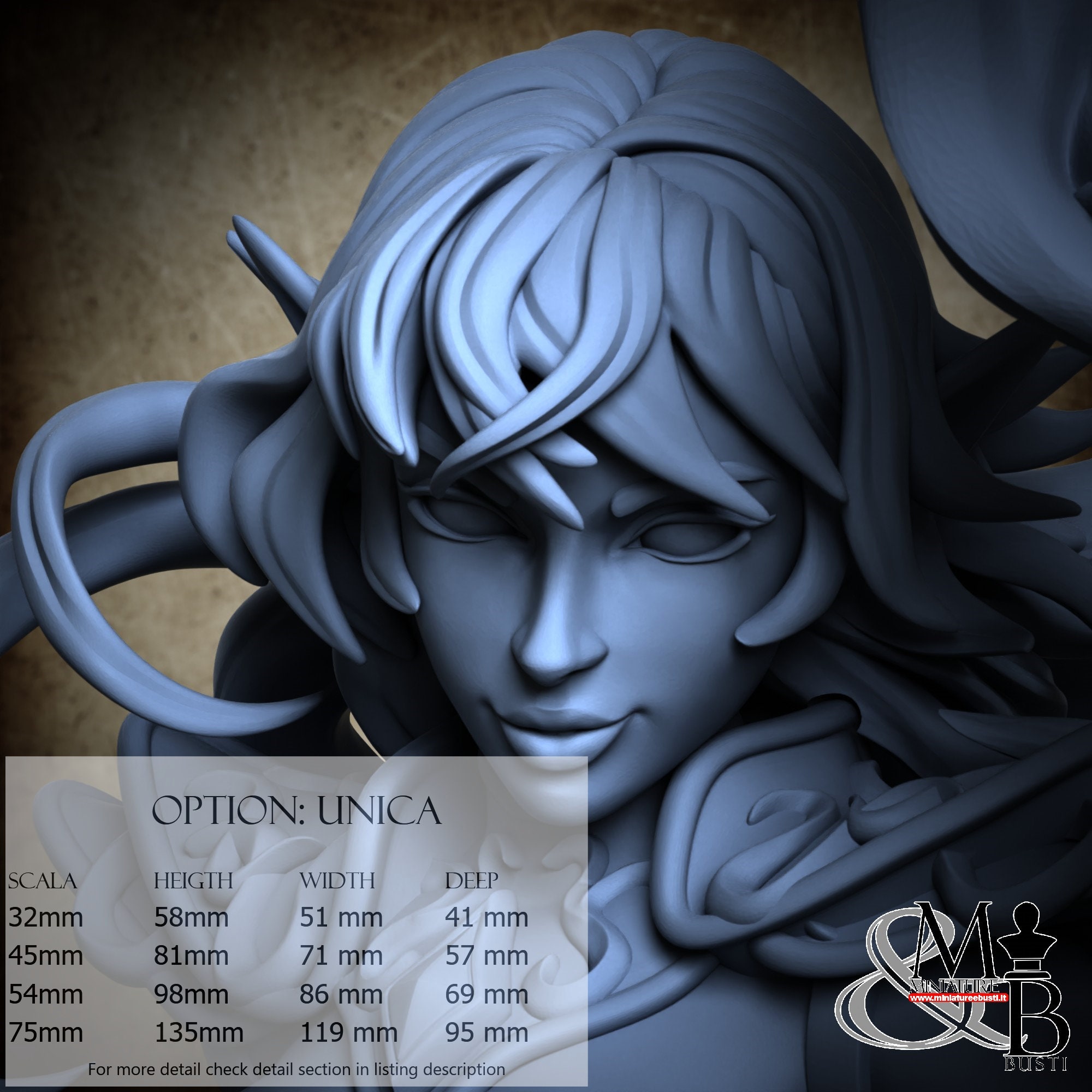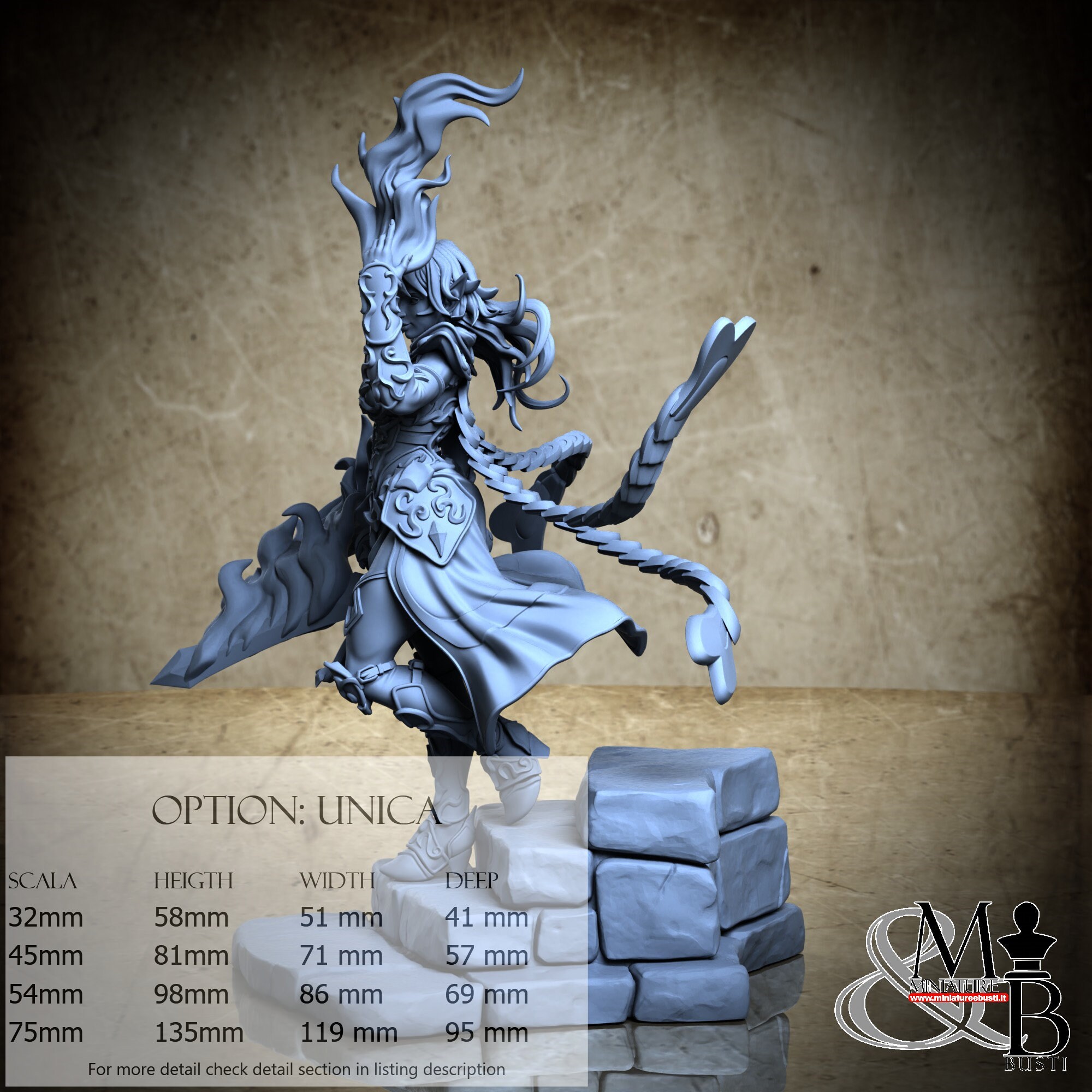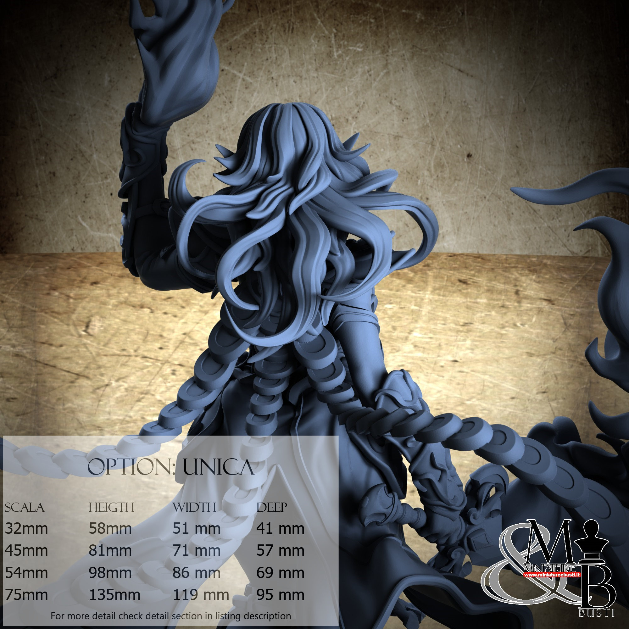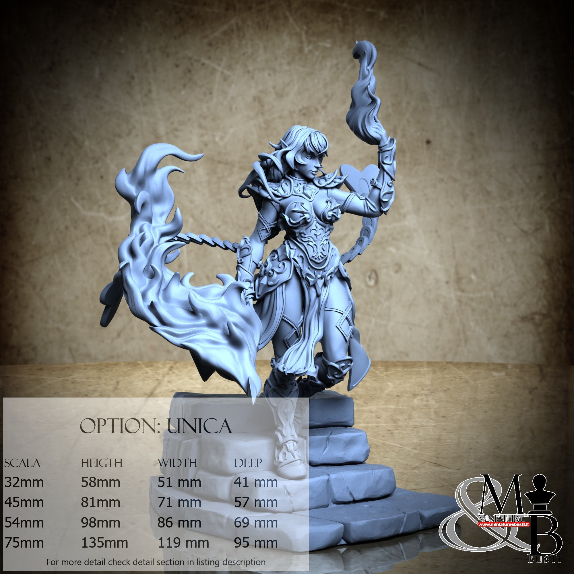 - Base (1 piece) in Resin: Height: 32 mm, Width: 81 mm, Depth: 95 mm