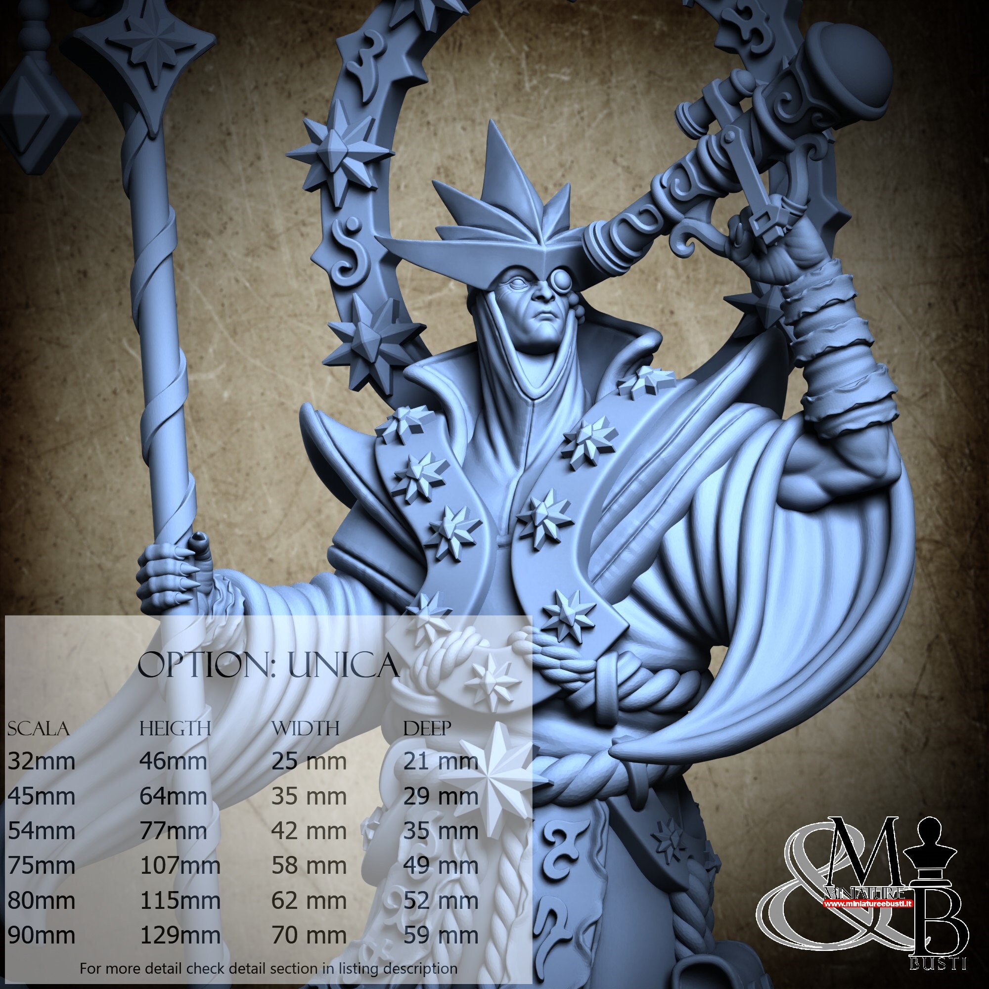 - Figure (1 piece) in Resin: Height: 70 mm, Width: 40 mm, Depth: 33 mm