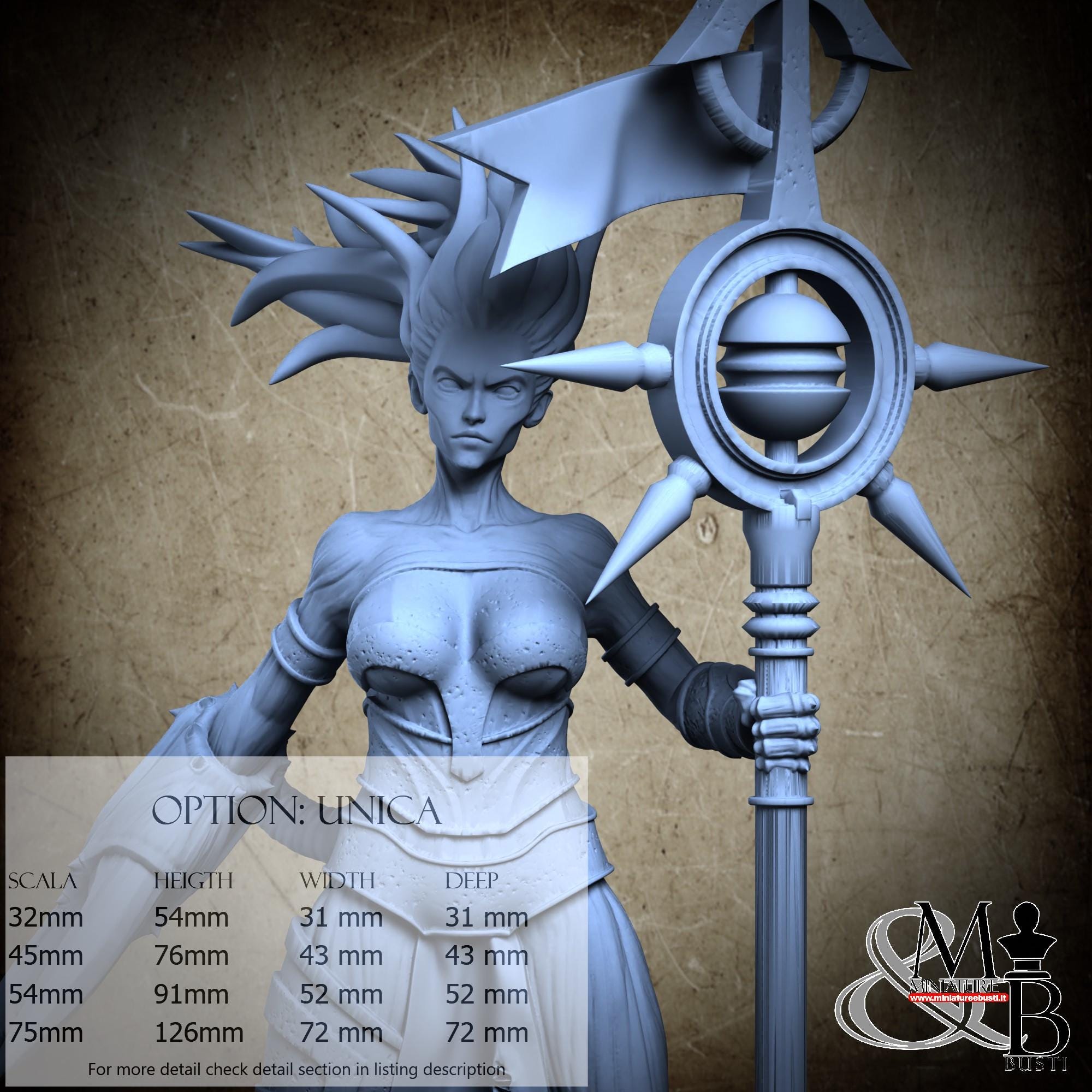 - Figure (1 piece) in Resin: Height: 84 mm, Width: 49 mm, Depth: 38 mm