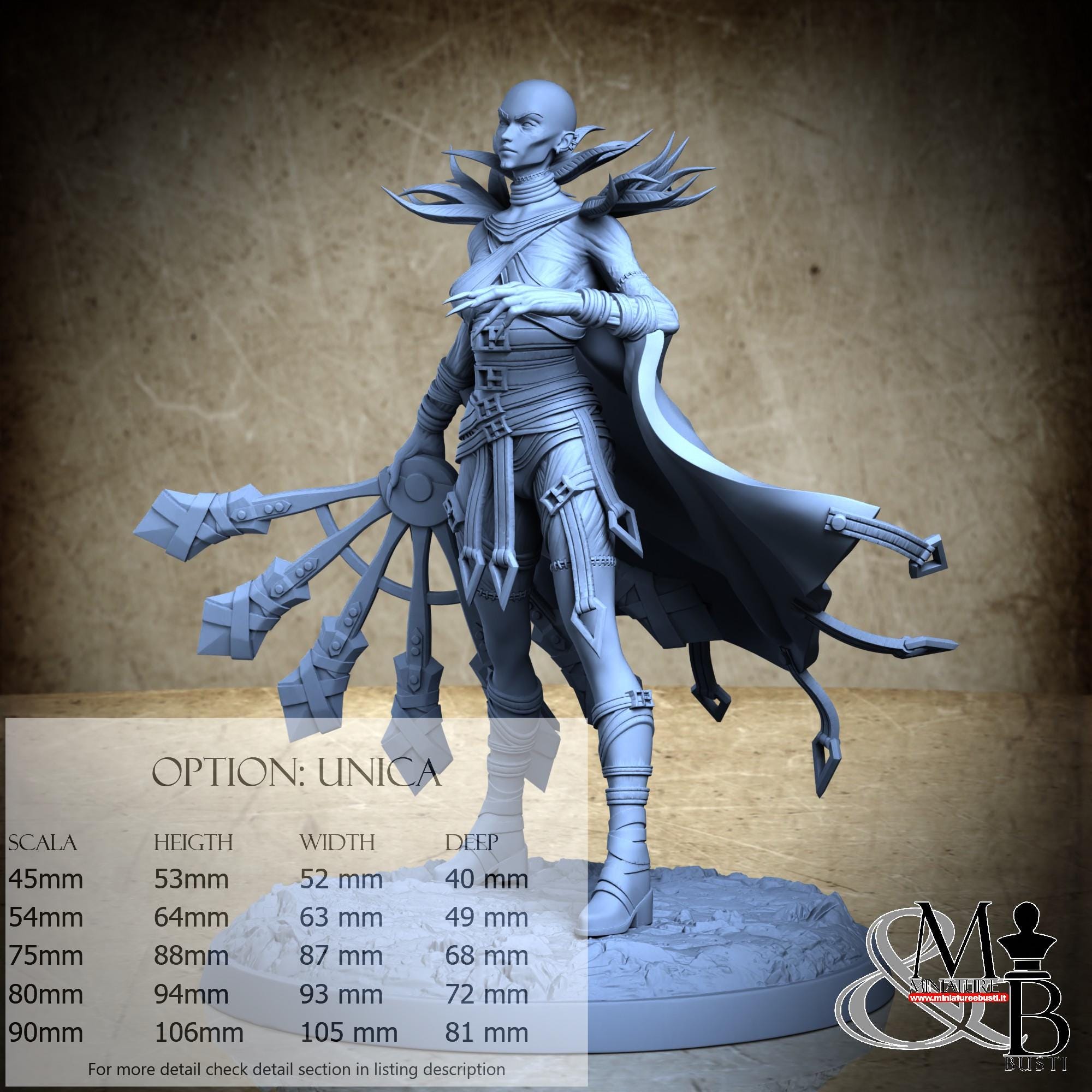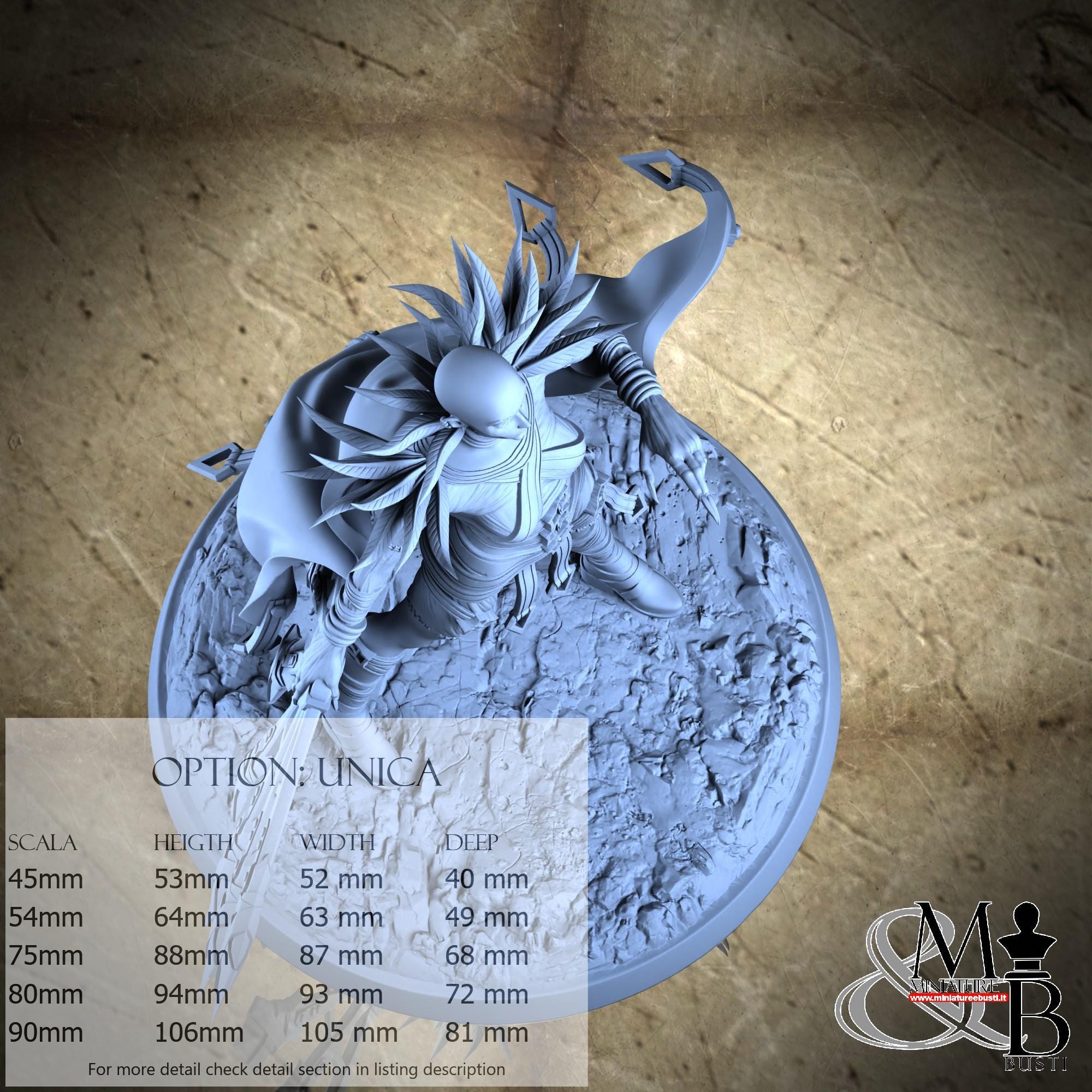 - Base (1 piece) in Resin: Height: 10 mm, Width: 72 mm, Depth: 72 mm