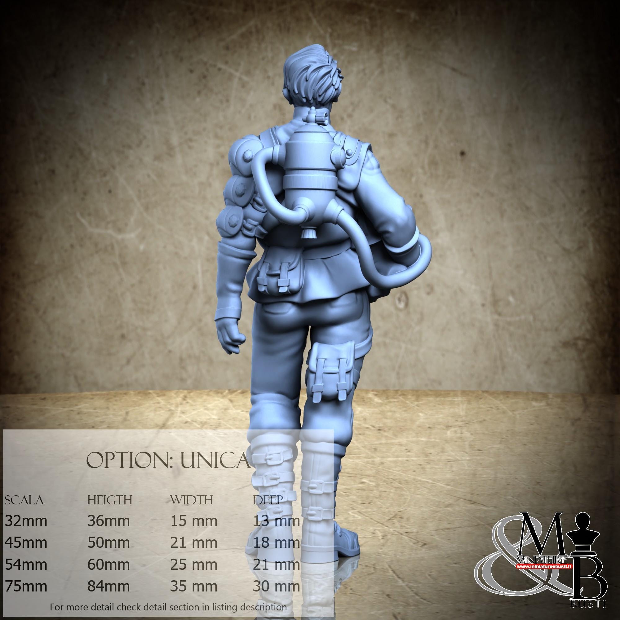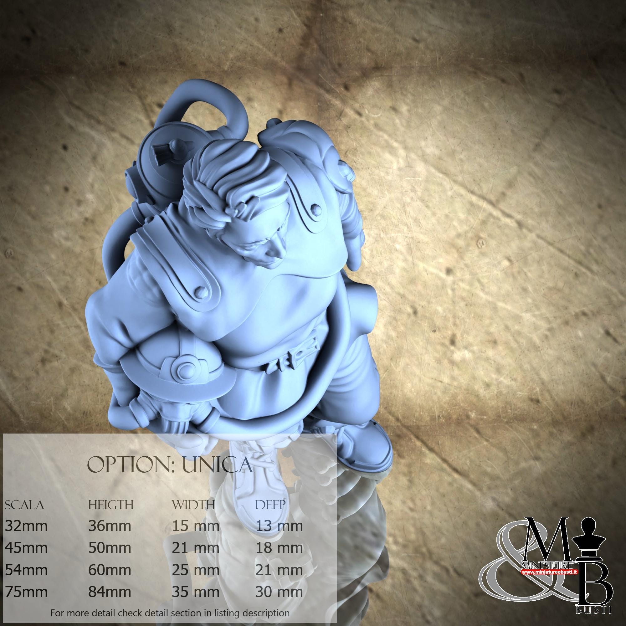 - Figure (1 piece) in Resin: Height: 36 mm, Width: 15 mm, Depth: 13 mm