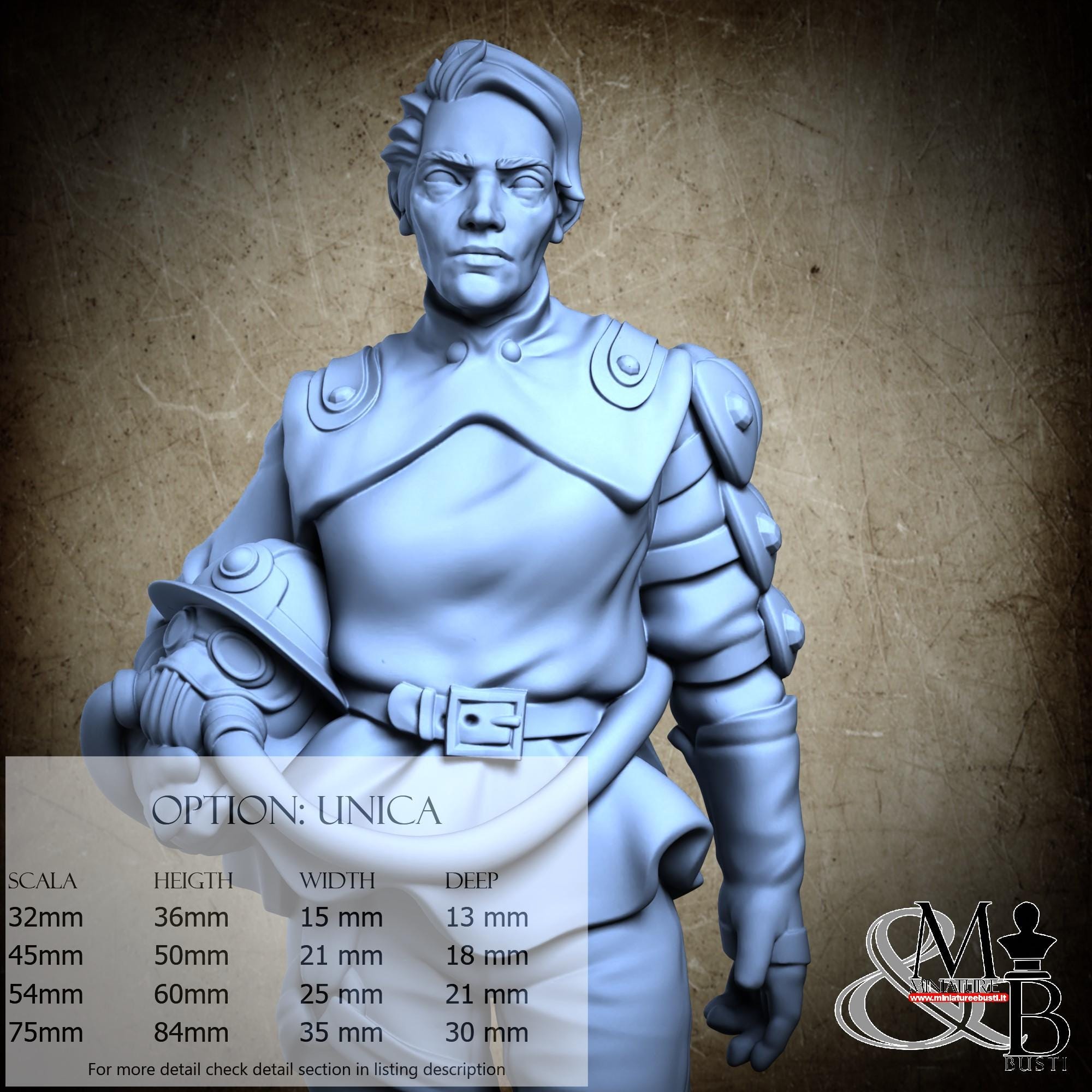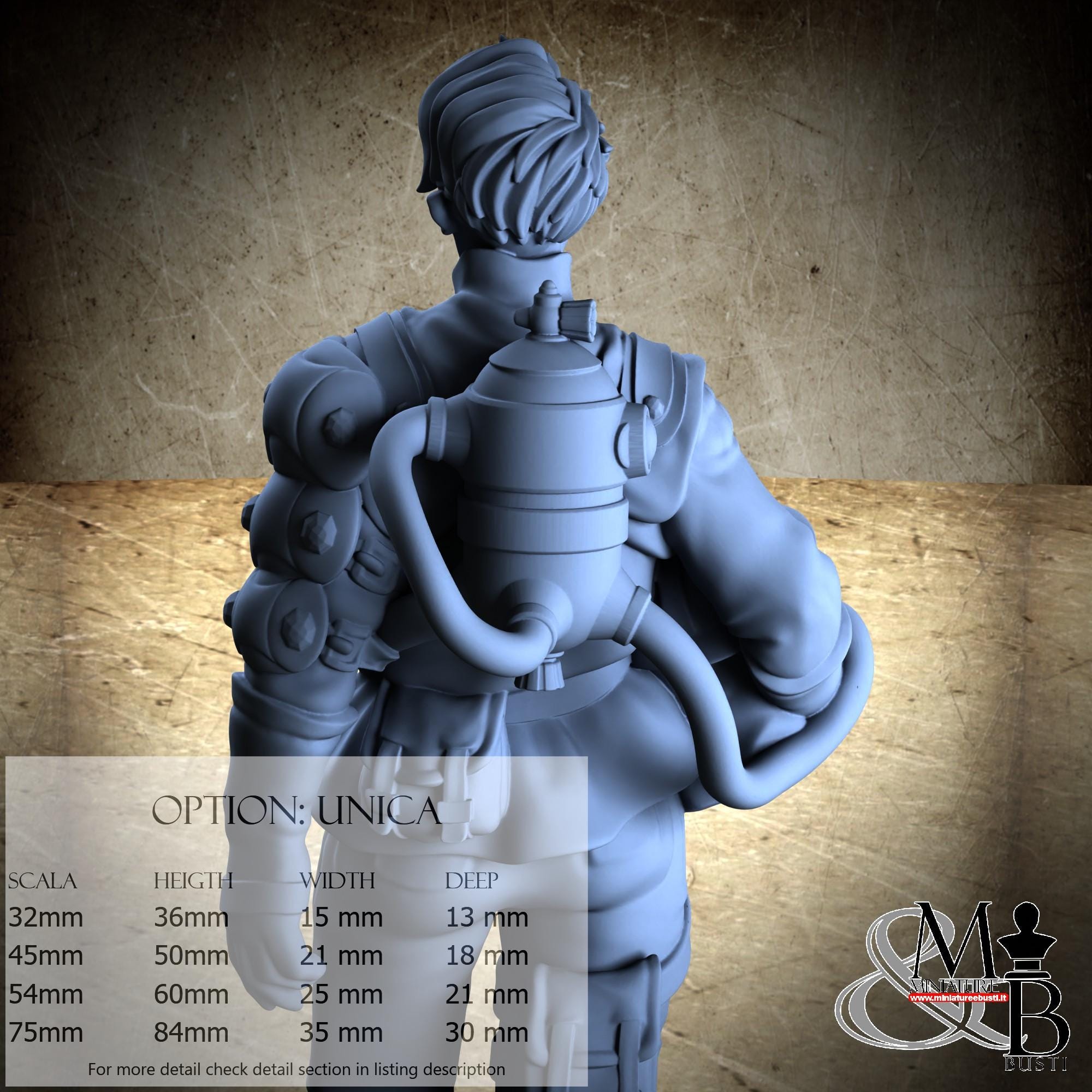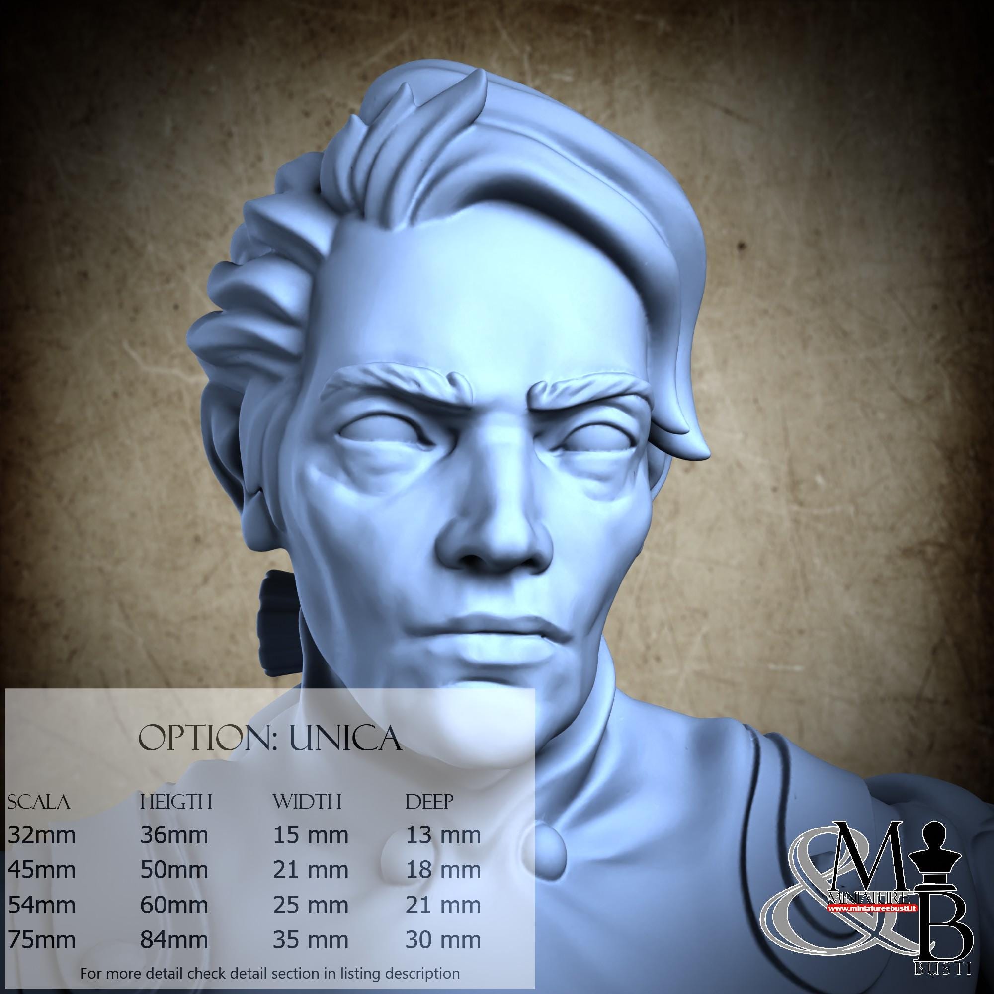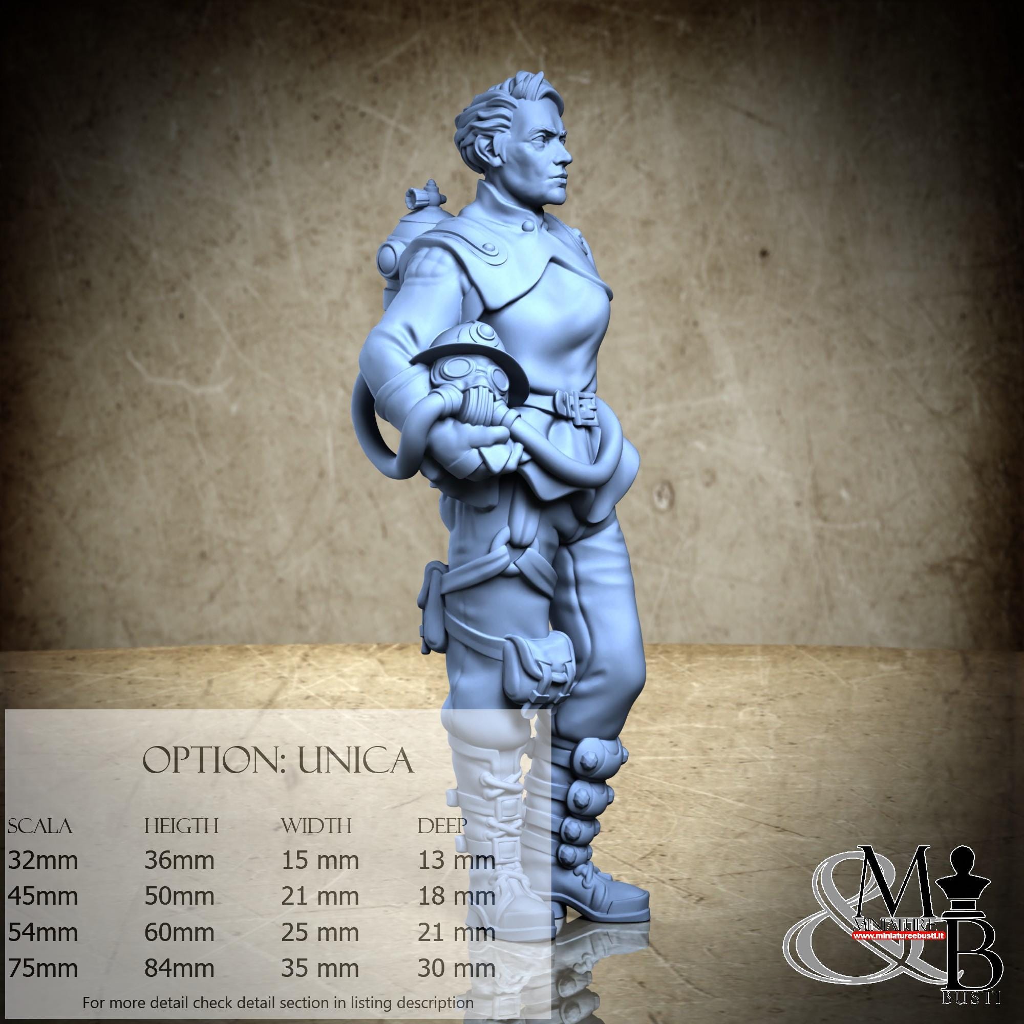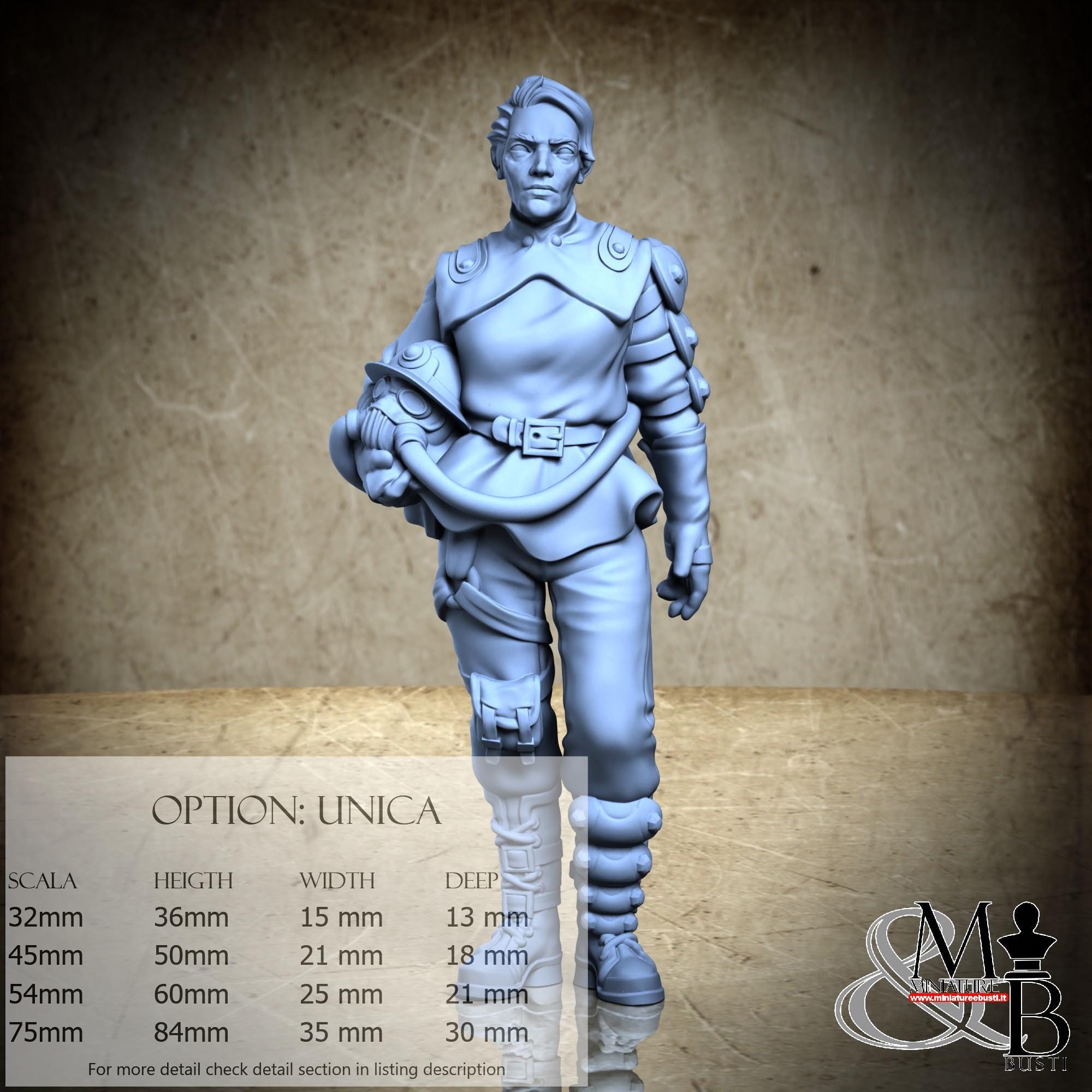 - Figure (1 piece) in Resin: Height: 84 mm, Width: 35 mm, Depth: 30 mm