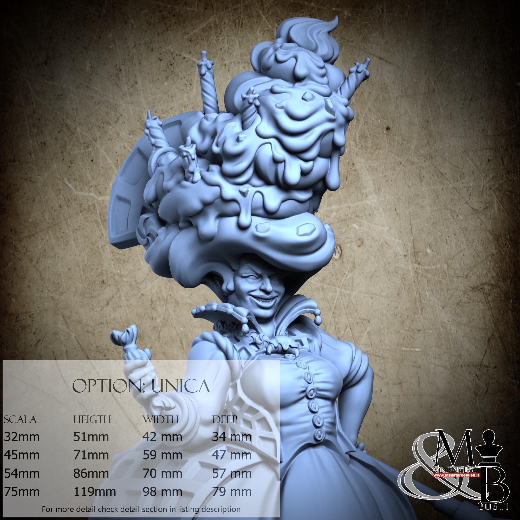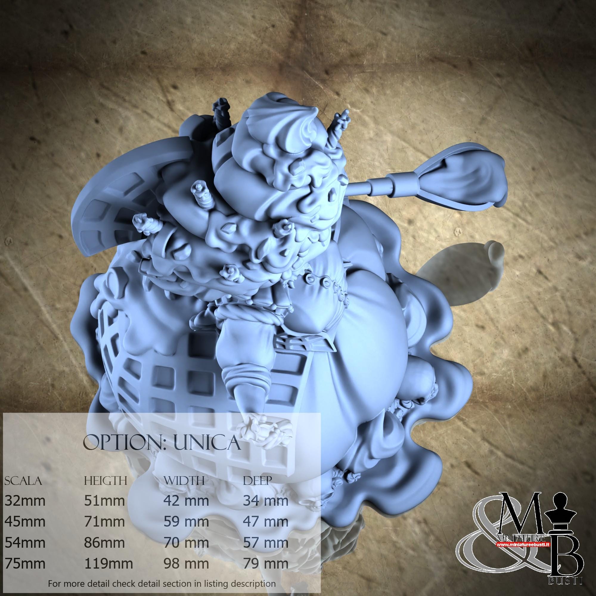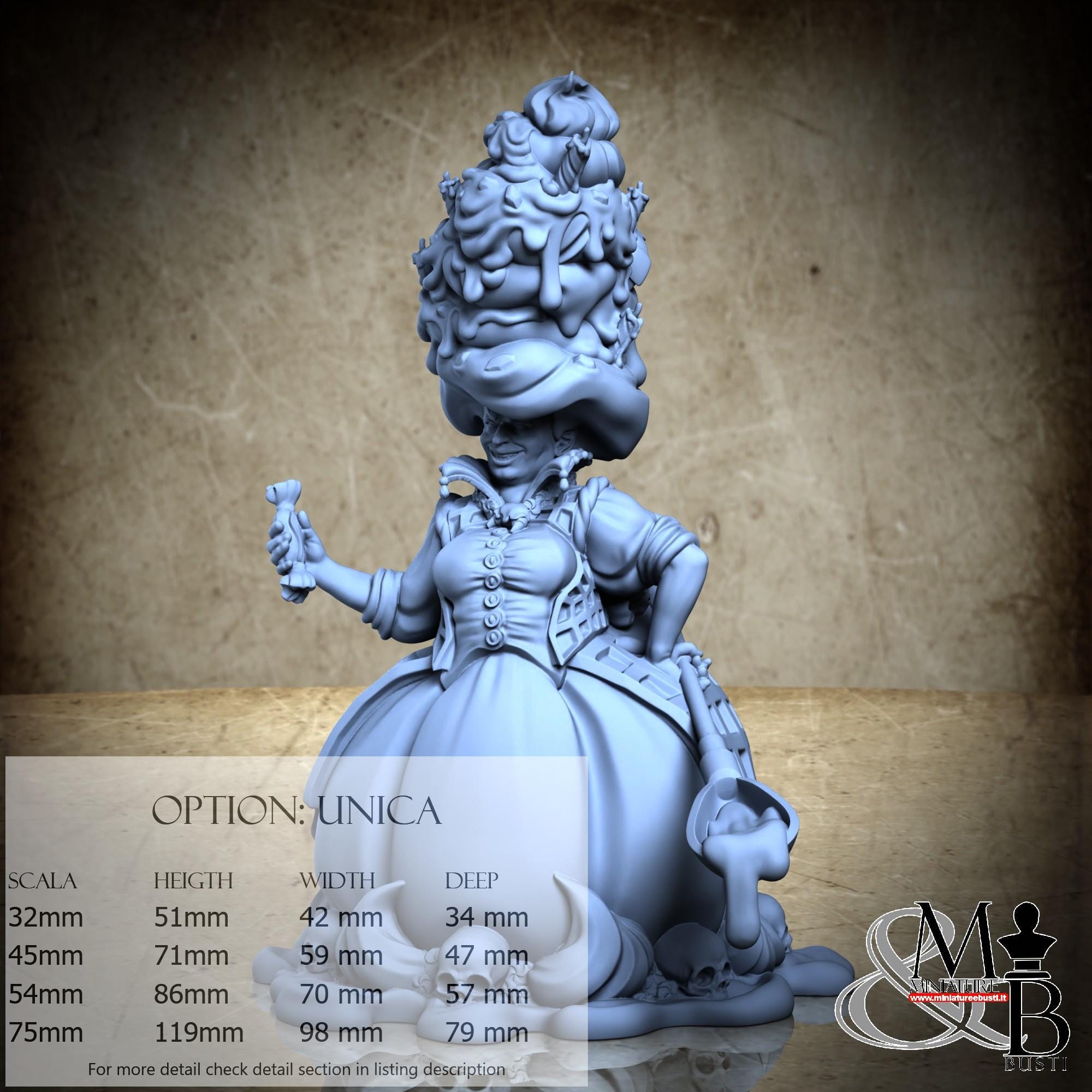 - Figure (1 piece) in Resin: Height: 51 mm, Width: 42 mm, Depth: 34 mm