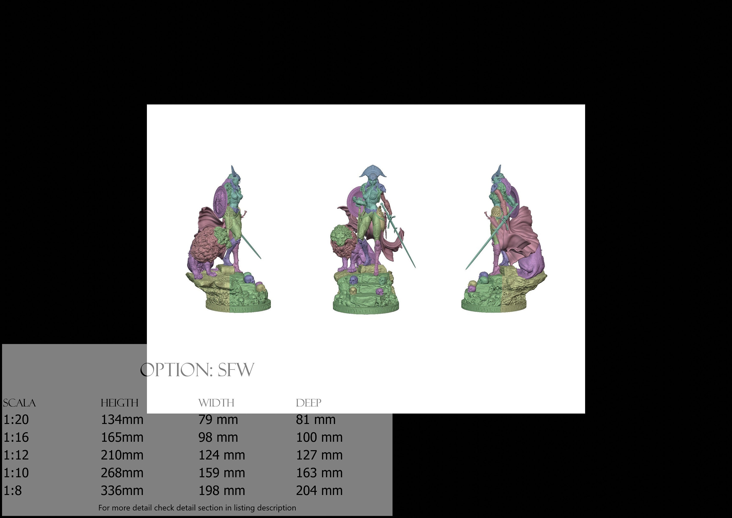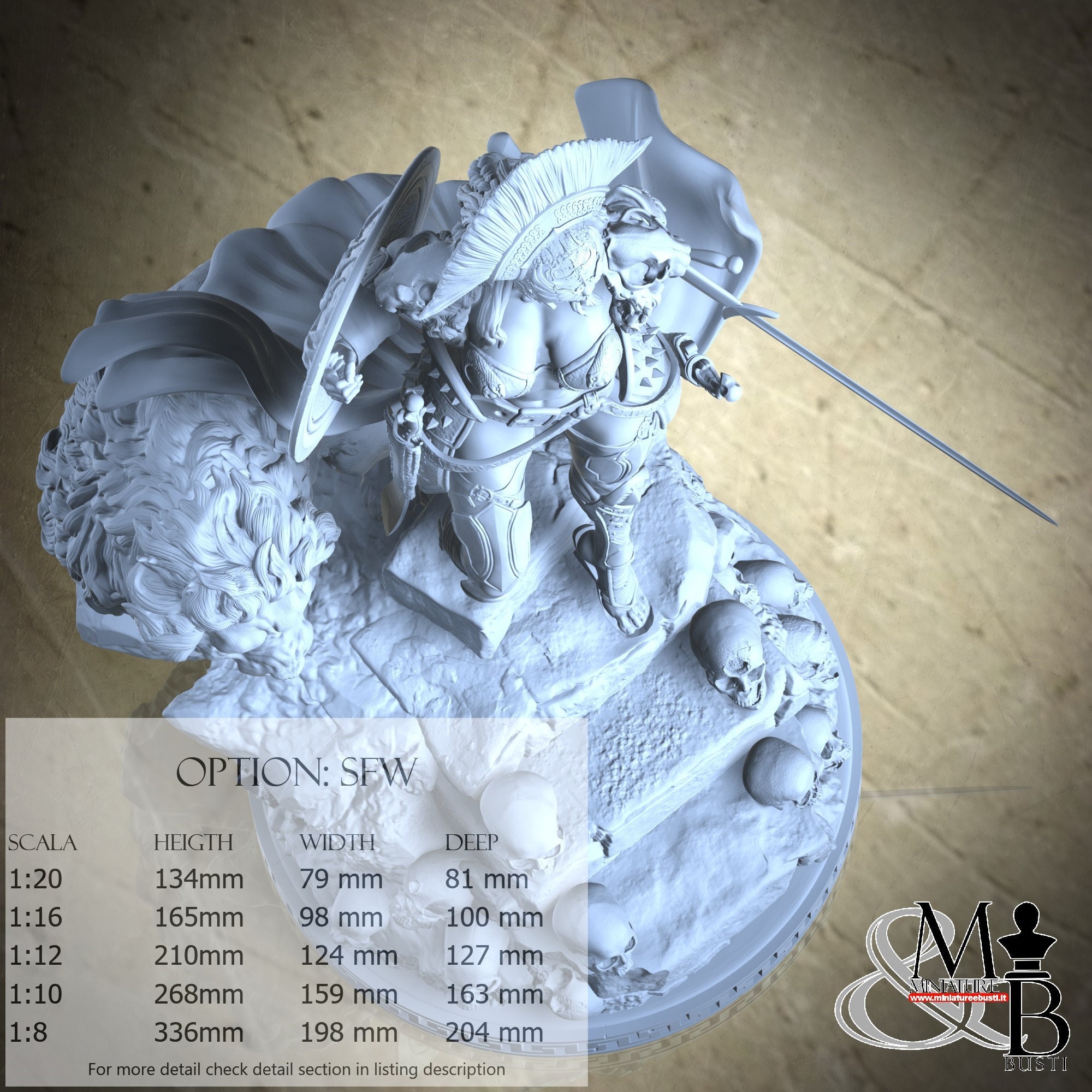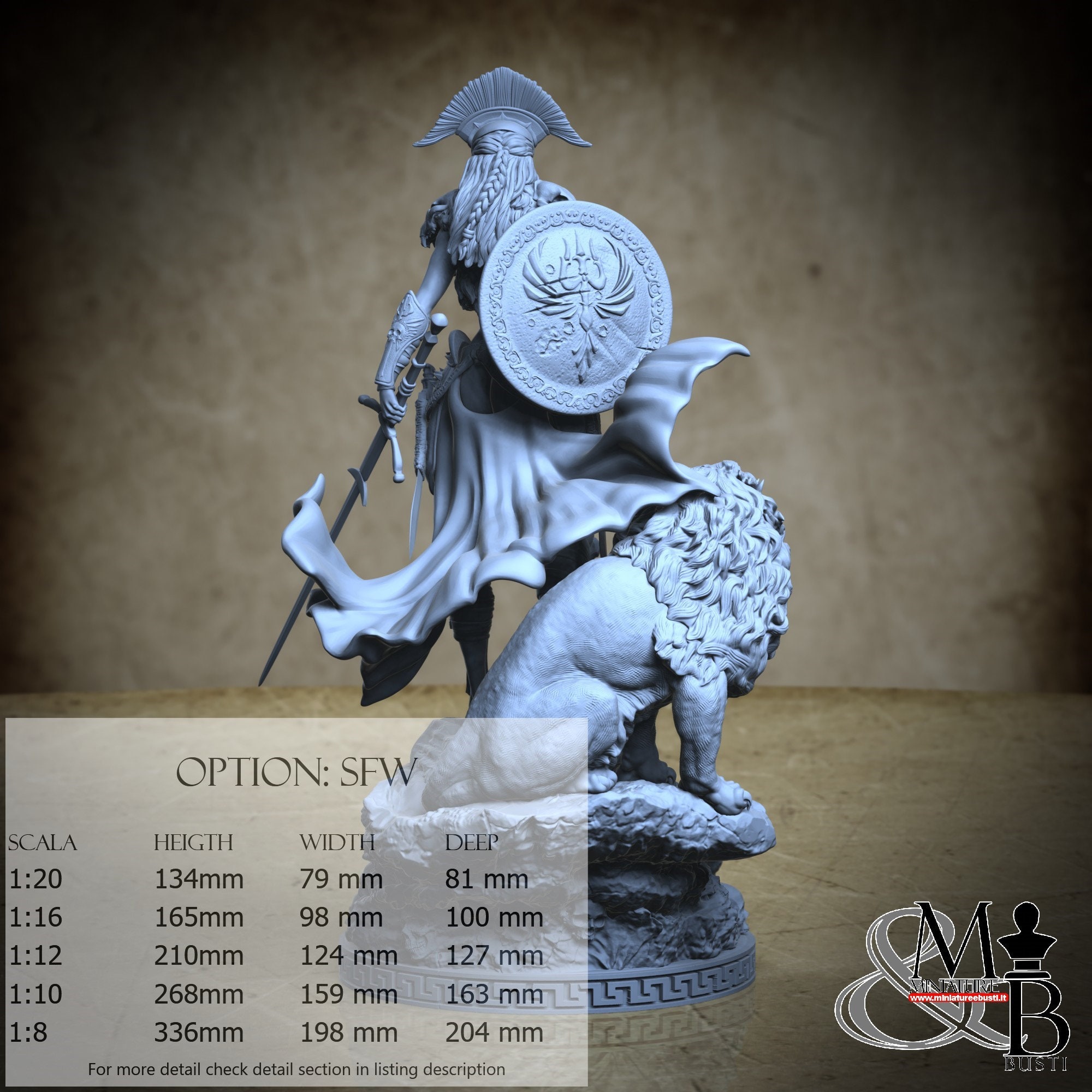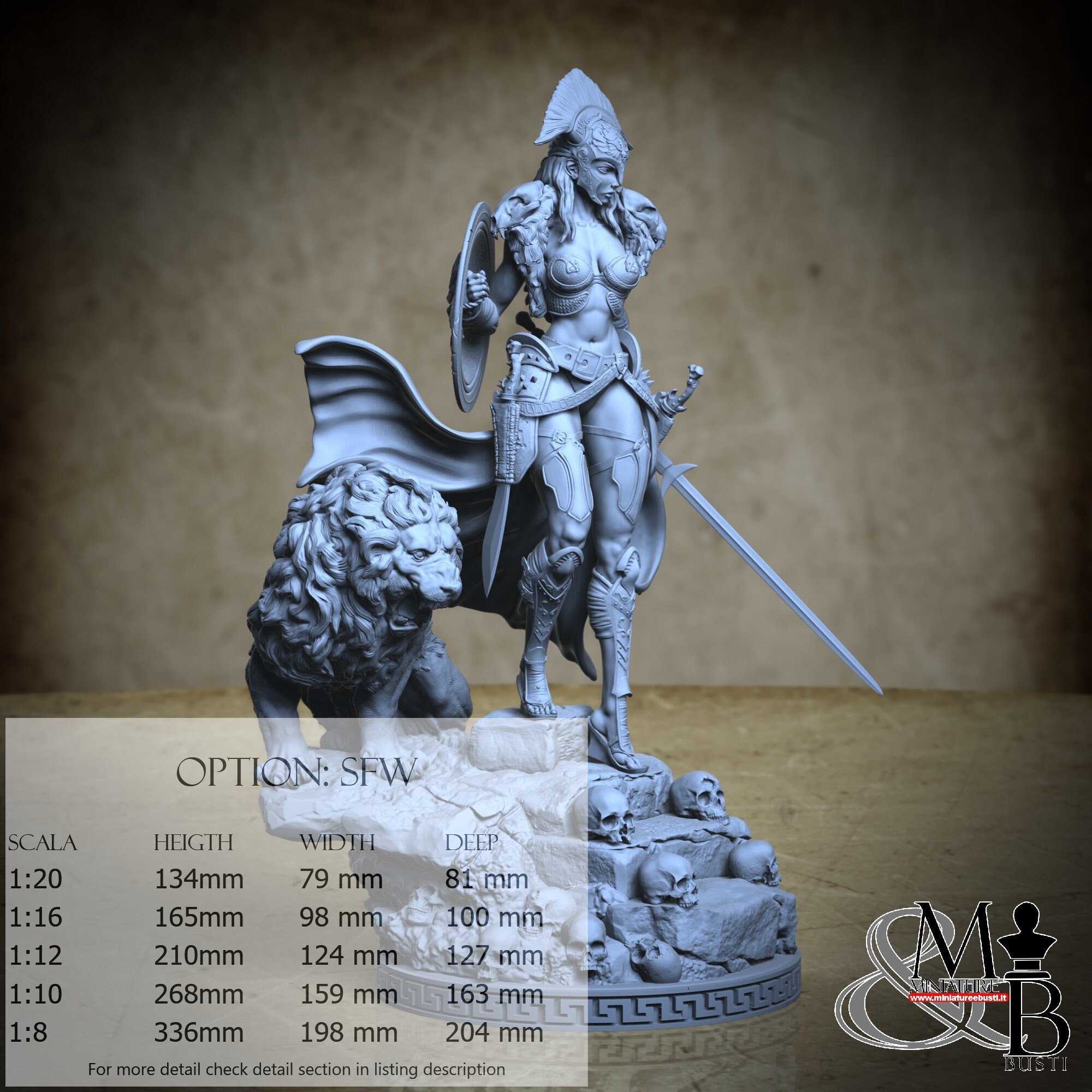 Una bellissima rivisitazione del Dio Marte in versione femminile, che scende da una scalinata in pietra, in compagnia di un leone ruggente, con mantello al vento, scudo e spadone.L'armatura è una versione Fantasy Eroica della classica armatura greca come da cultura pop.
