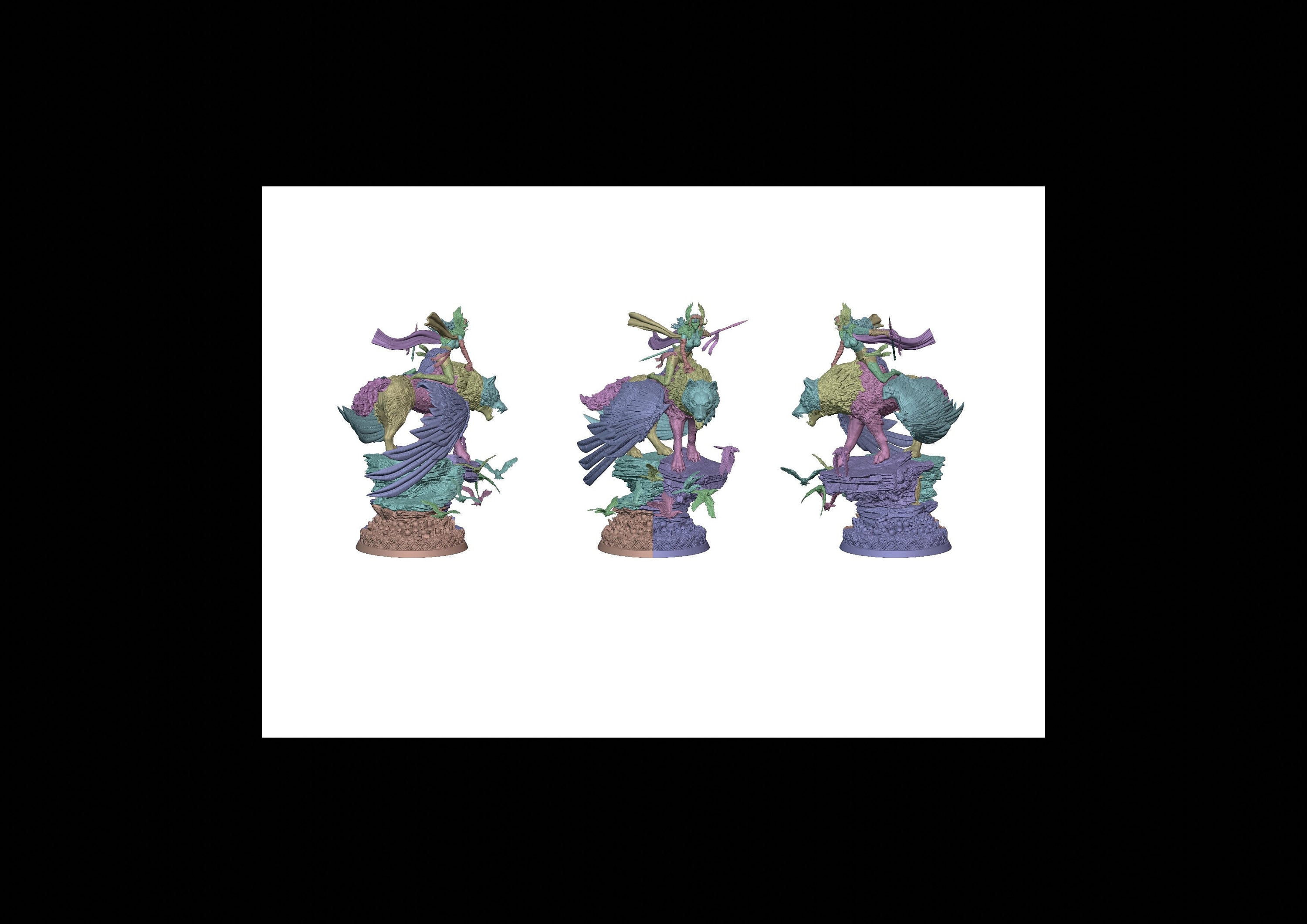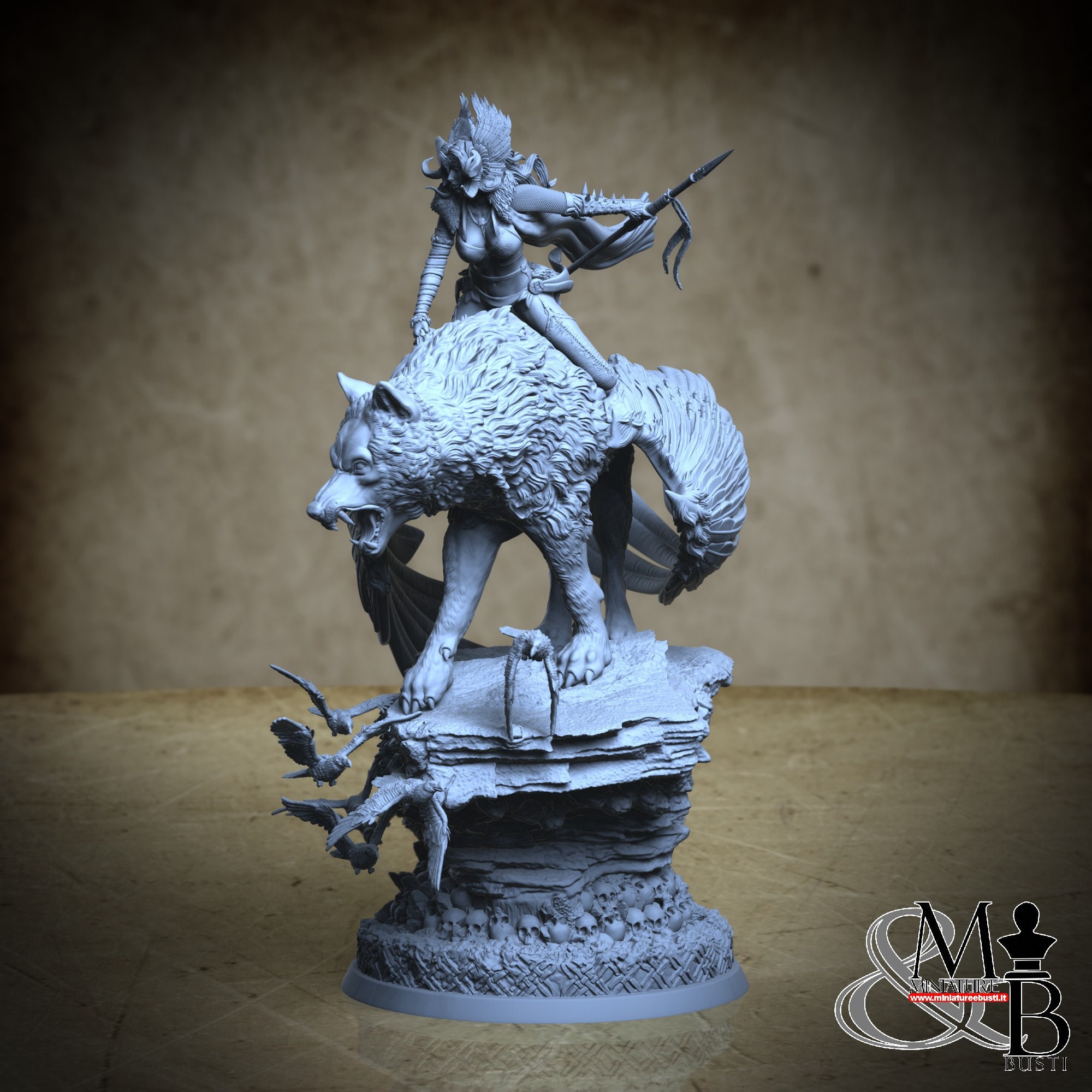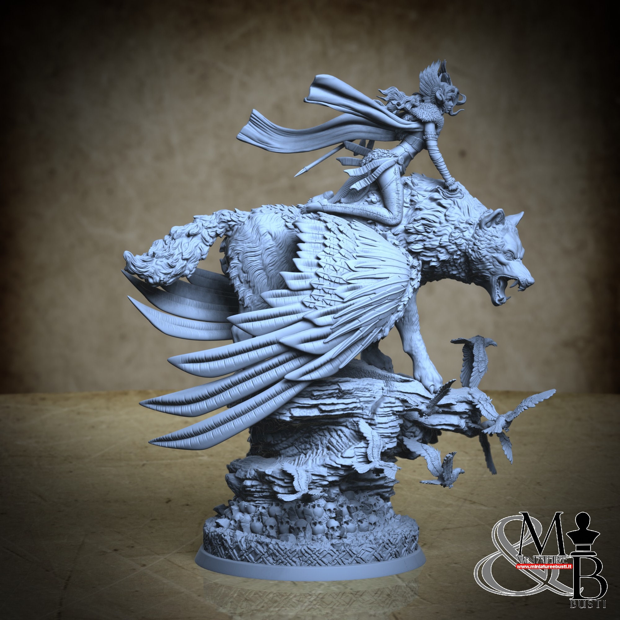 A beautiful Valkyrie riding a winged wolf, on a rock, while a flight of crows circles around the scene.