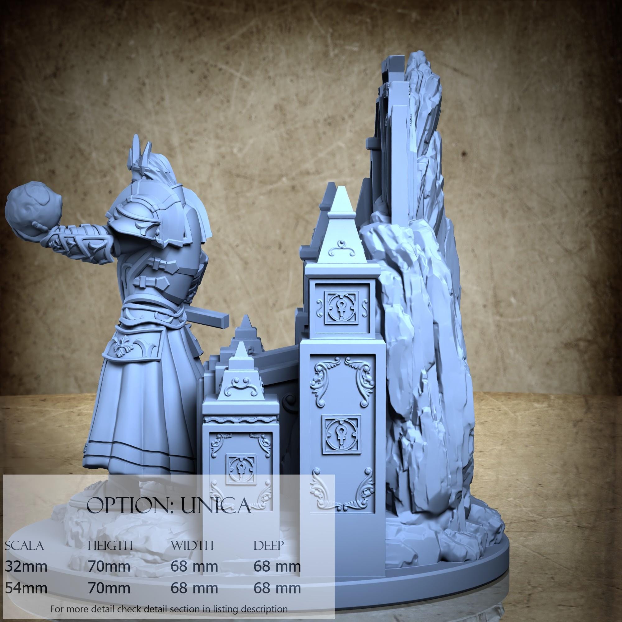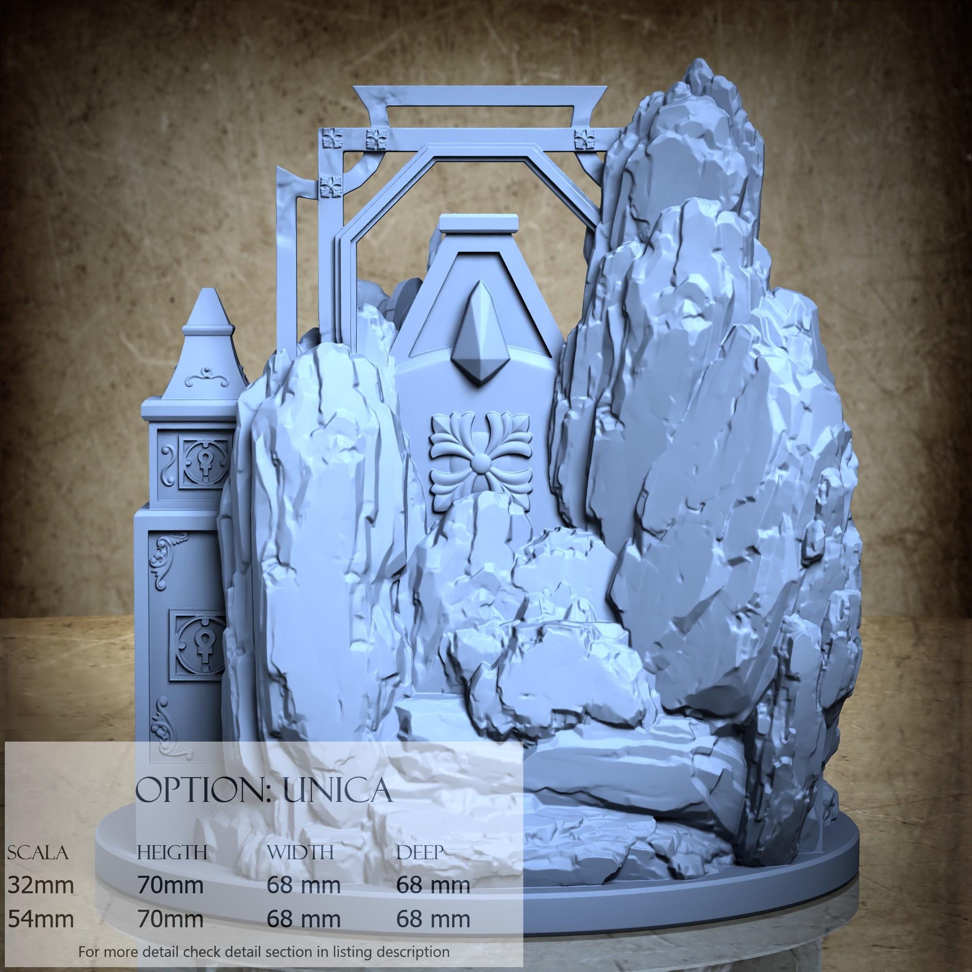 - Base (1 piece) in Resin: Height: 70 mm, Width: 68 mm, Depth: 68 mm