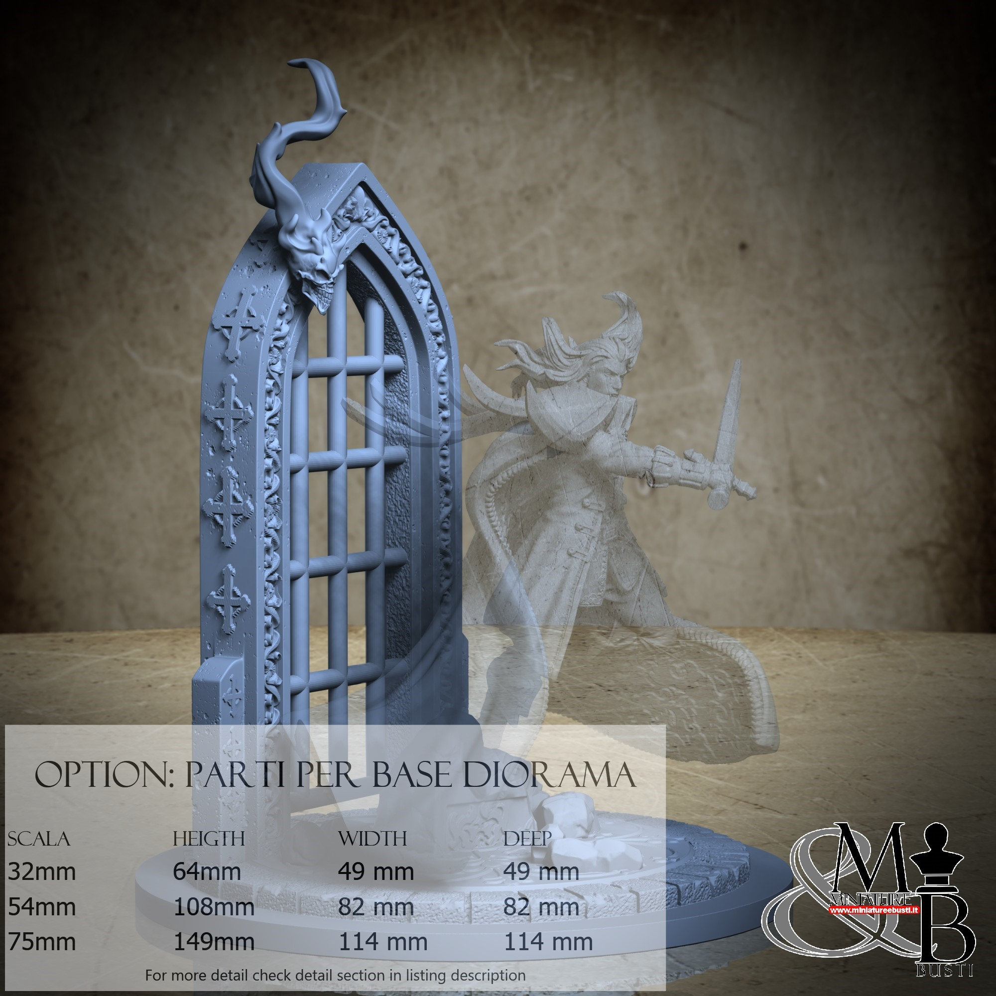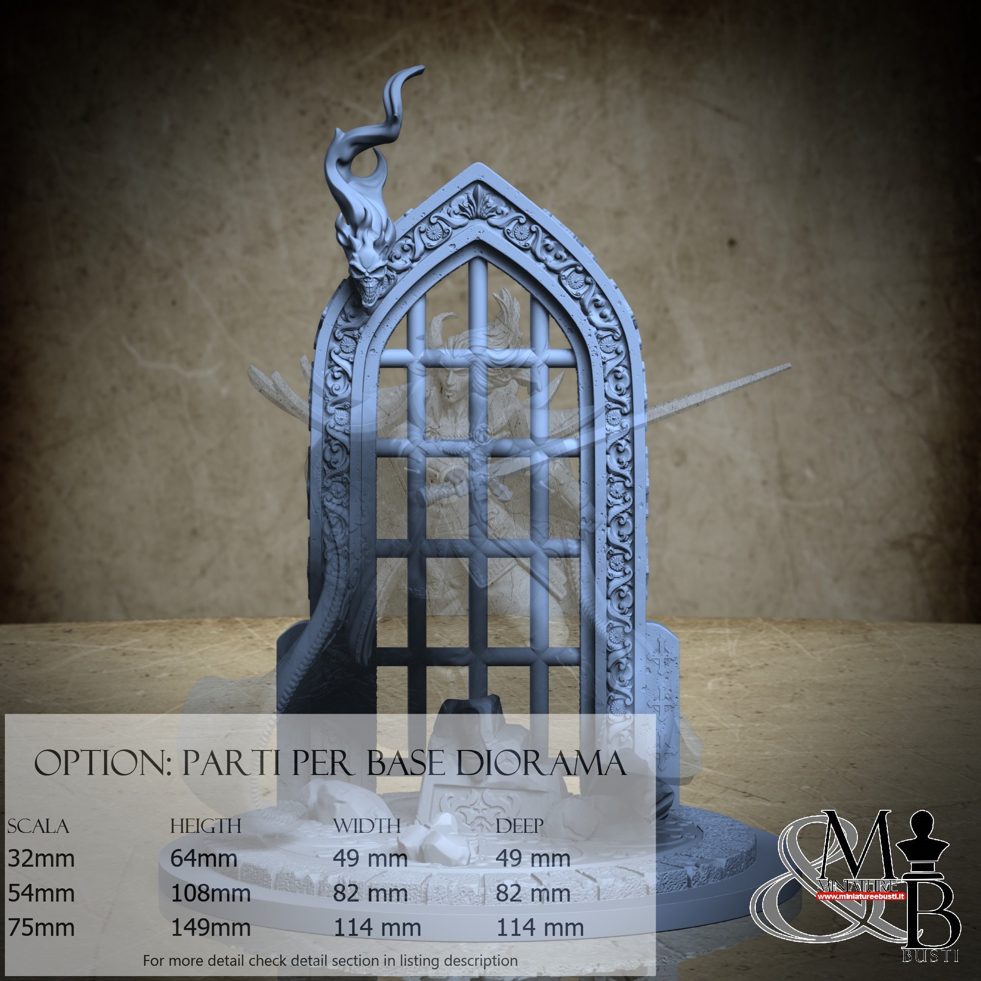 - Diorama Base (2 pieces) in Resin: Height: 57 mm, Width: 49 mm, Depth: 49 mm