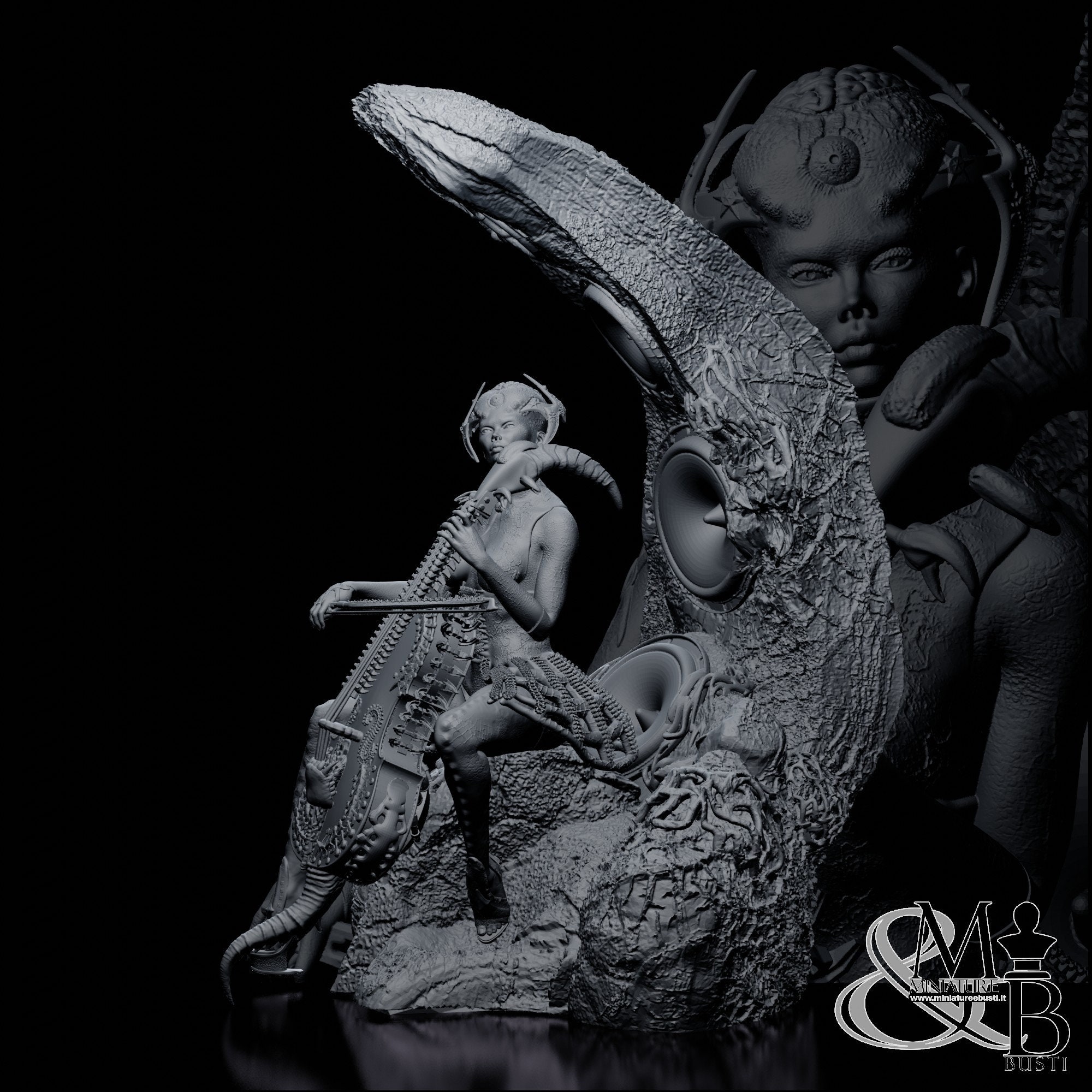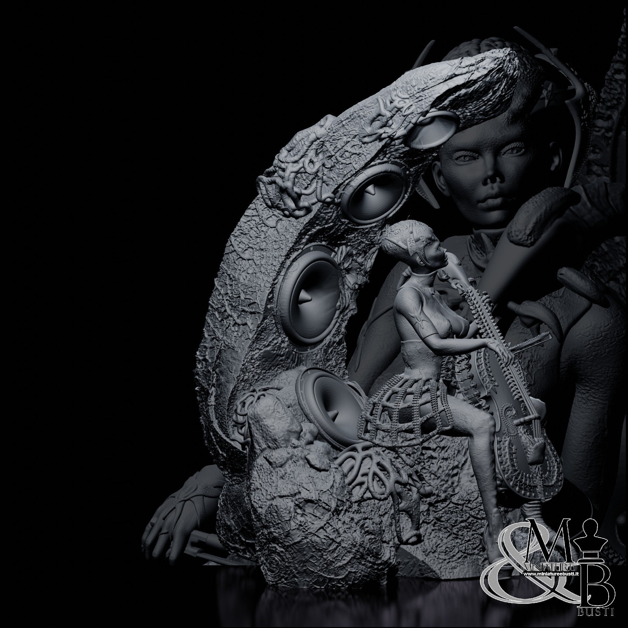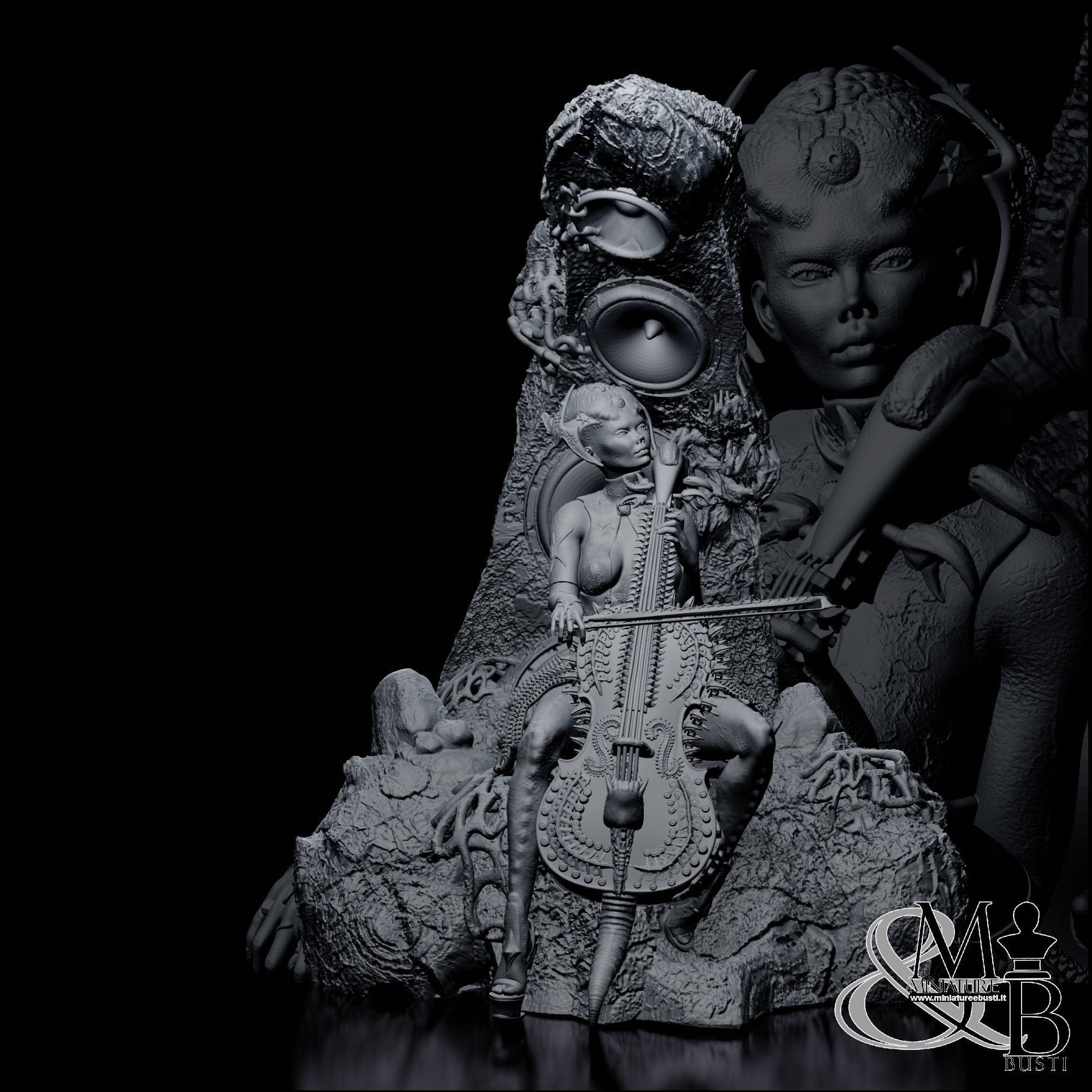 Beautiful sculpture depicting a vaguely alien-like girl playing the cello, sitting on a structure that also functions as an amplifier.