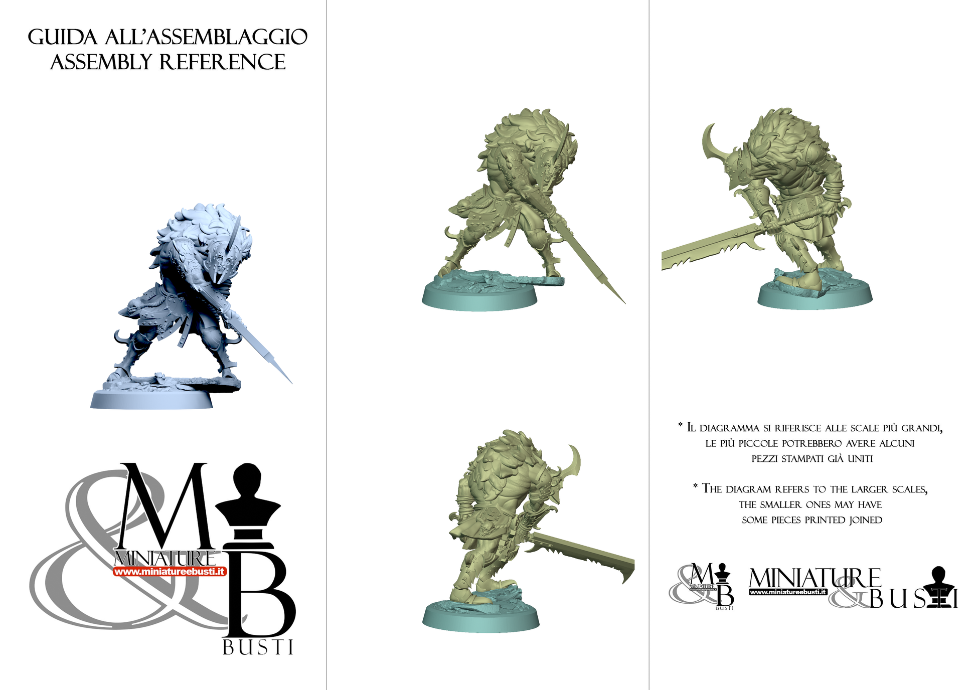 Questa è una MINIATURA. Le miniatura sono modelli pensati per i giochi di ruolo, ad esempio dungeons & Dragons, che poi ridimensioniamo in alto o in basso per le differenti scale. Di solito sono originariamente scolpiti per sistemi a 32mm (dove un uomo standard è alto 32mm dai piedi alla testa). Le proporzioni sono pensate tenendo in considerazione che verranno maneggiate spesso, quindi dettagli come spade e scudi sono particolarmente spessi. La miniatura viene venduta come appare nell'immagine, e dato che alcuni autori non aggiungono una base, se questa è assente nell'immagine significa che non verrà fornita con la miniatura.