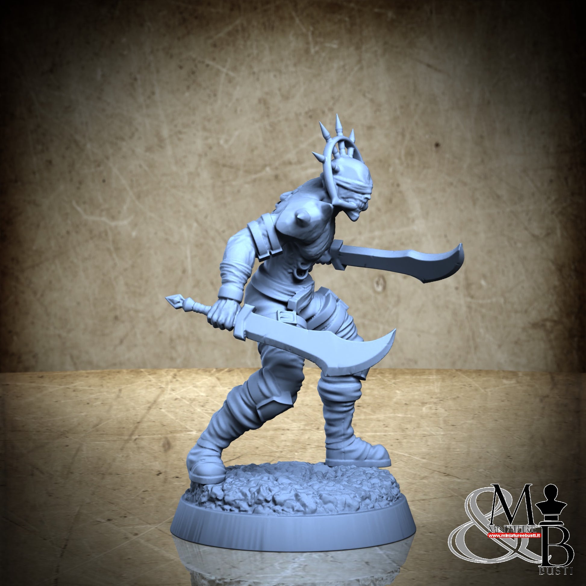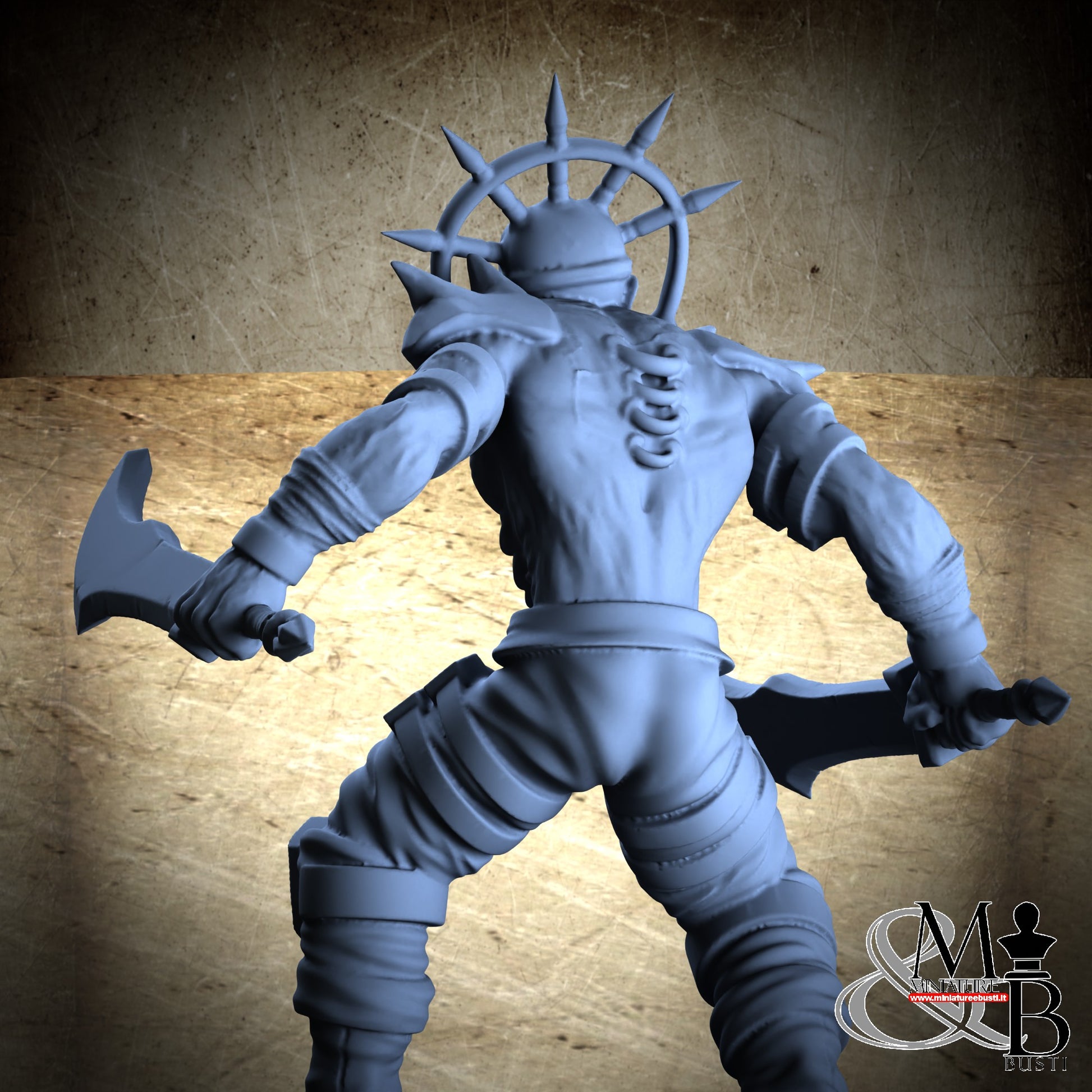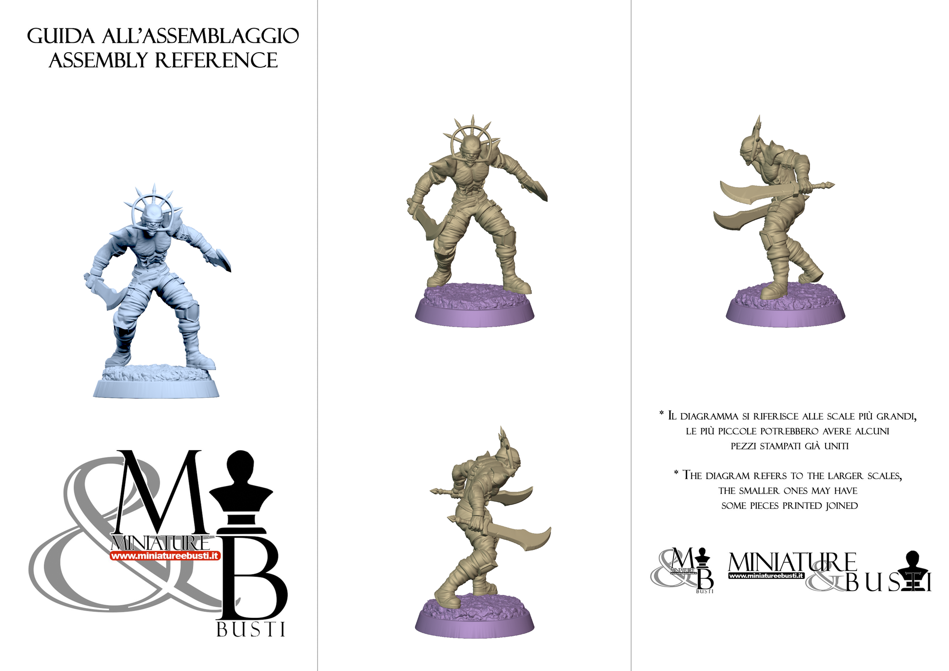 Questa è una MINIATURA. Le miniatura sono modelli pensati per i giochi di ruolo, ad esempio dungeons & Dragons, che poi ridimensioniamo in alto o in basso per le differenti scale. Di solito sono originariamente scolpiti per sistemi a 32mm (dove un uomo standard è alto 32mm dai piedi alla testa). Le proporzioni sono pensate tenendo in considerazione che verranno maneggiate spesso, quindi dettagli come spade e scudi sono particolarmente spessi. La miniatura viene venduta come appare nell'immagine, e dato che alcuni autori non aggiungono una base, se questa è assente nell'immagine significa che non verrà fornita con la miniatura.