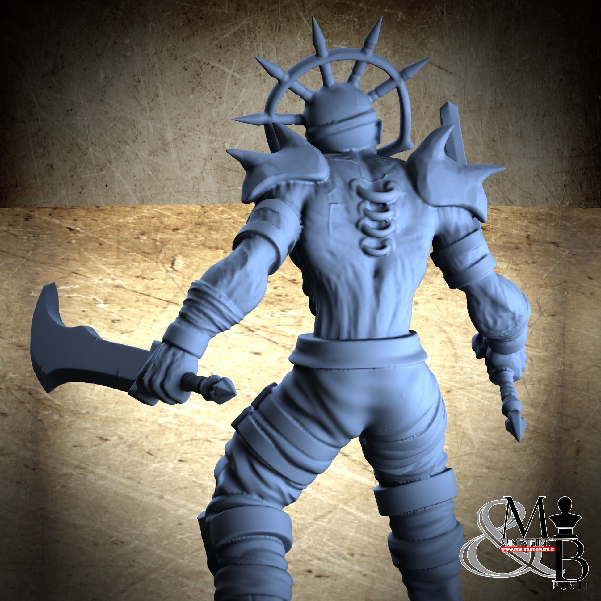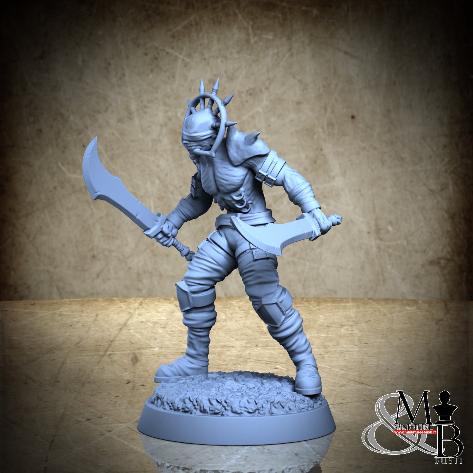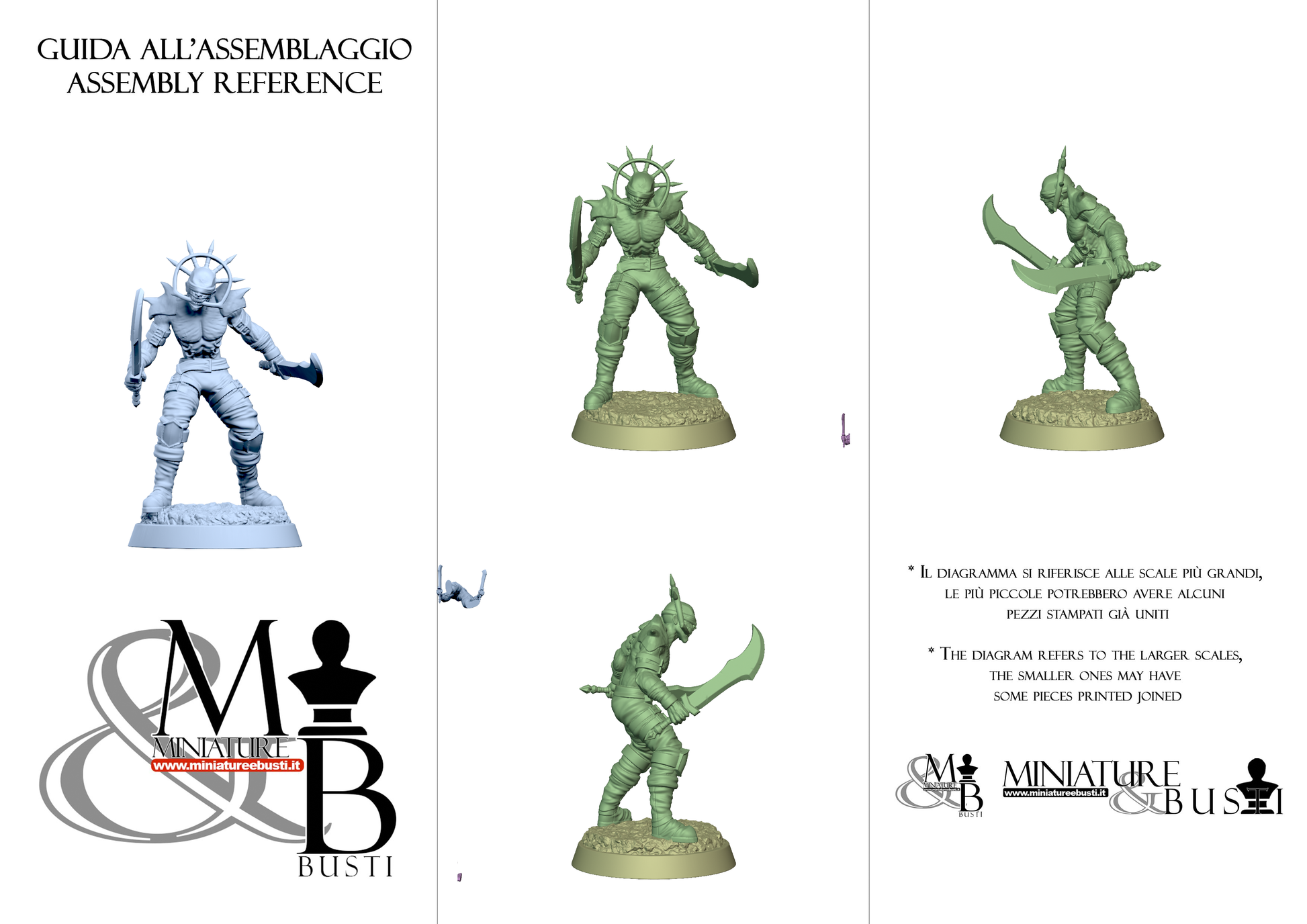 Questa è una MINIATURA. Le miniatura sono modelli pensati per i giochi di ruolo, ad esempio dungeons & Dragons, che poi ridimensioniamo in alto o in basso per le differenti scale. Di solito sono originariamente scolpiti per sistemi a 32mm (dove un uomo standard è alto 32mm dai piedi alla testa). Le proporzioni sono pensate tenendo in considerazione che verranno maneggiate spesso, quindi dettagli come spade e scudi sono particolarmente spessi. La miniatura viene venduta come appare nell'immagine, e dato che alcuni autori non aggiungono una base, se questa è assente nell'immagine significa che non verrà fornita con la miniatura.