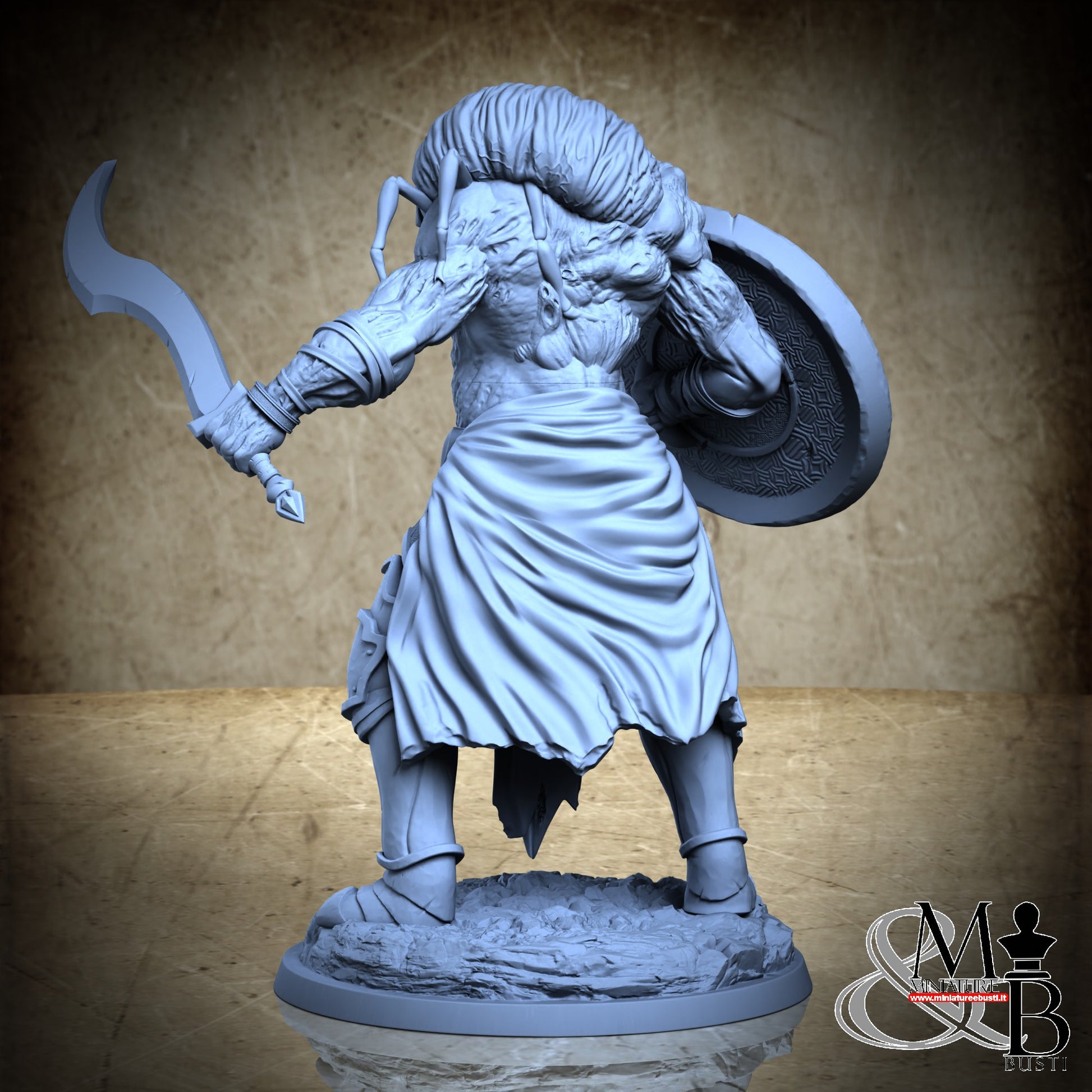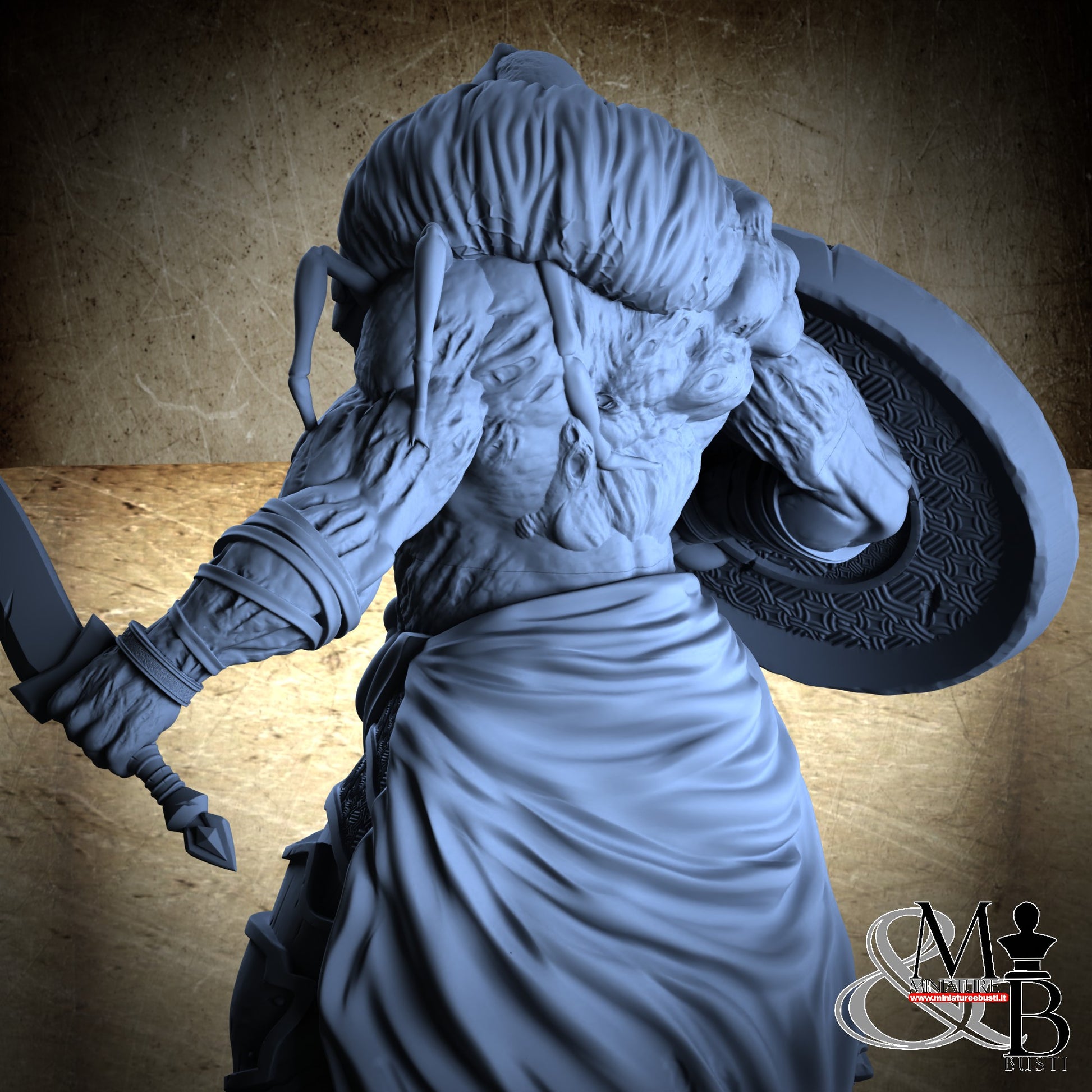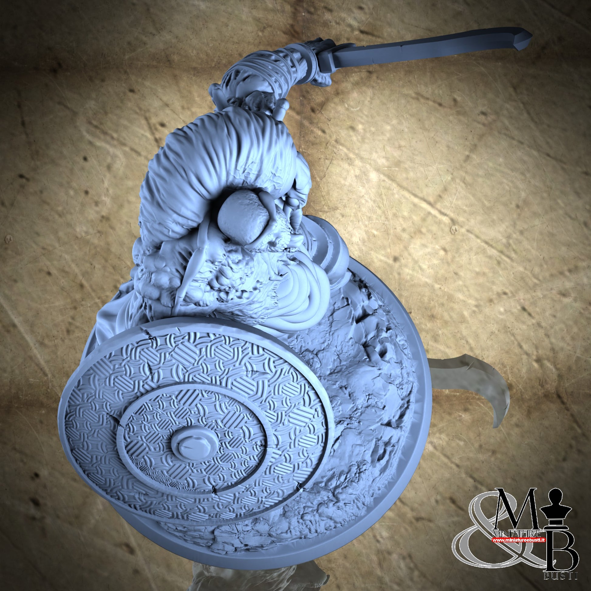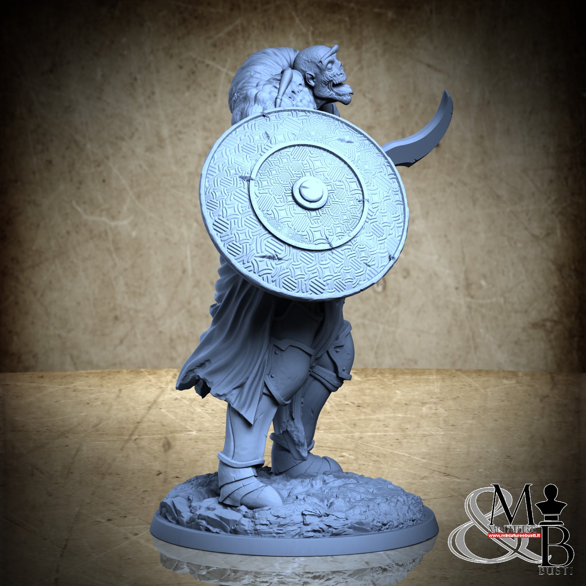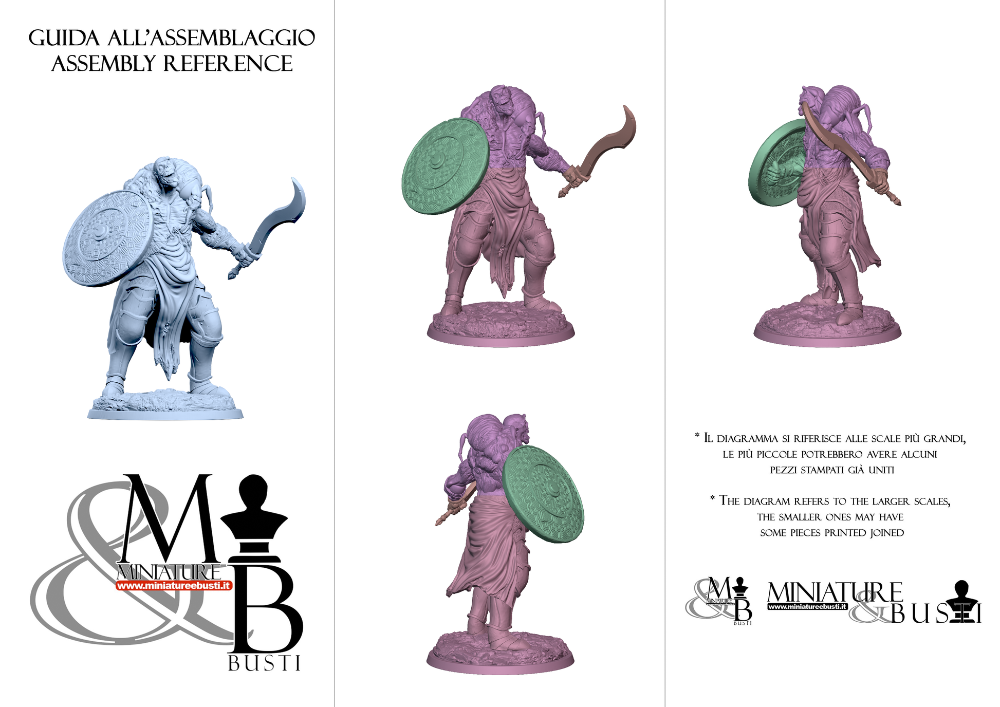 Questa è una MINIATURA. Le miniatura sono modelli pensati per i giochi di ruolo, ad esempio dungeons & Dragons, che poi ridimensioniamo in alto o in basso per le differenti scale. Di solito sono originariamente scolpiti per sistemi a 32mm (dove un uomo standard è alto 32mm dai piedi alla testa). Le proporzioni sono pensate tenendo in considerazione che verranno maneggiate spesso, quindi dettagli come spade e scudi sono particolarmente spessi. La miniatura viene venduta come appare nell'immagine, e dato che alcuni autori non aggiungono una base, se questa è assente nell'immagine significa che non verrà fornita con la miniatura.