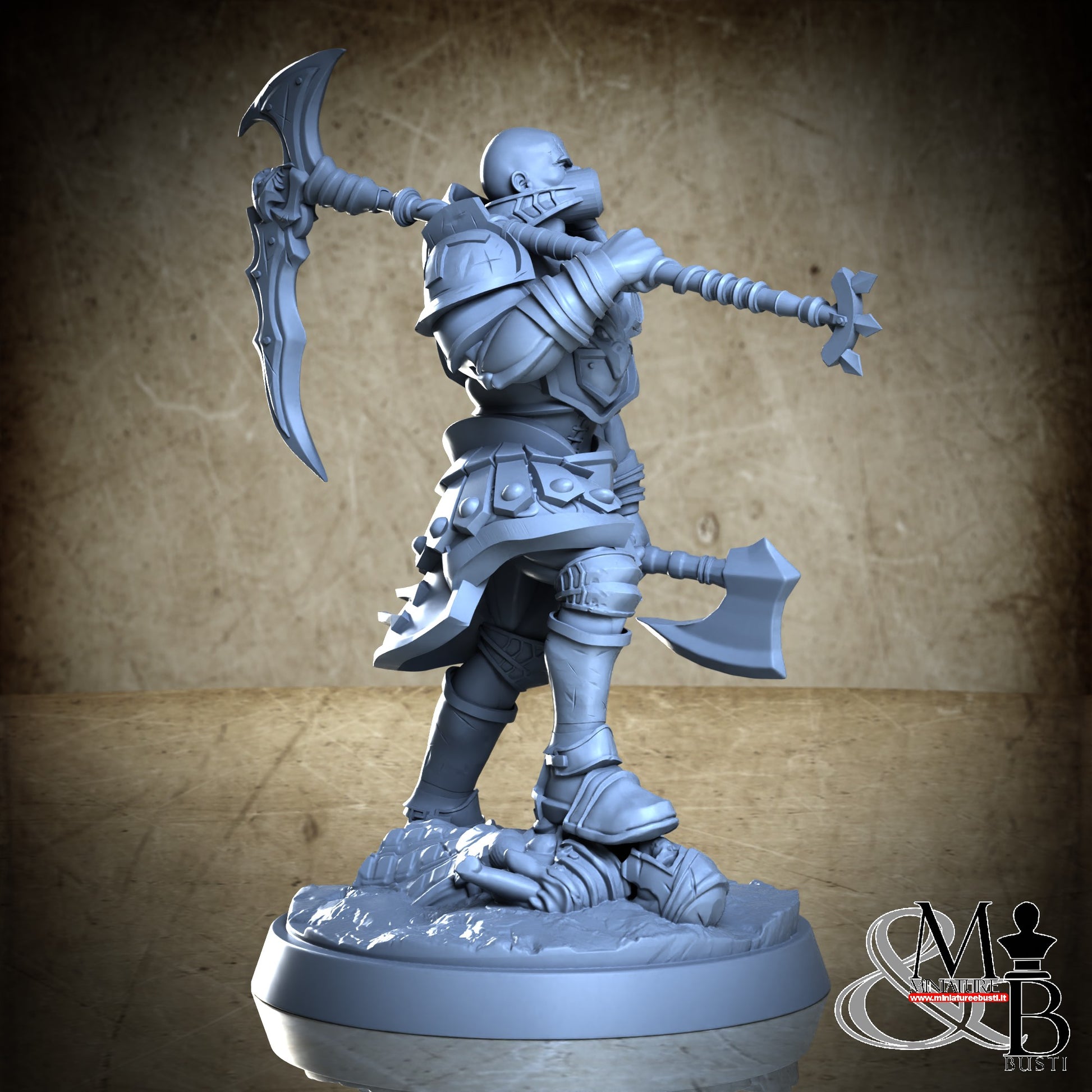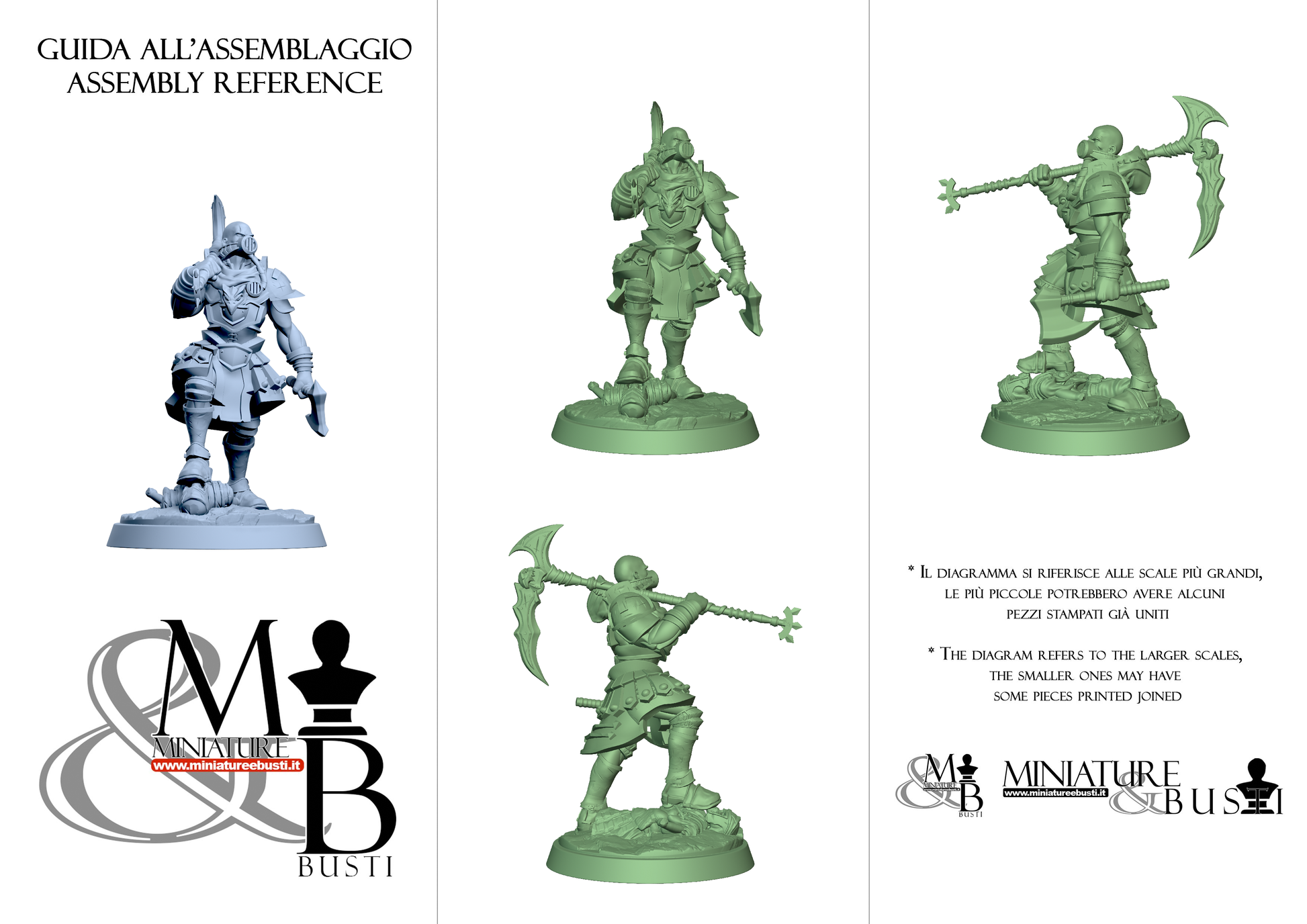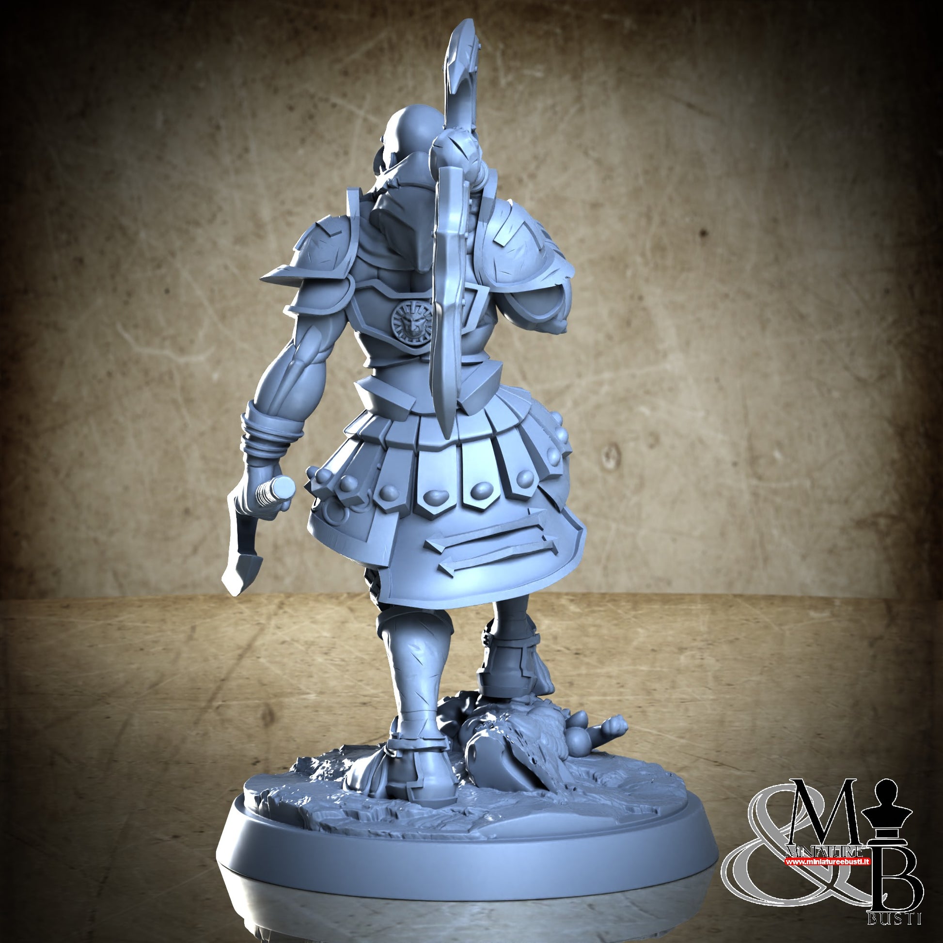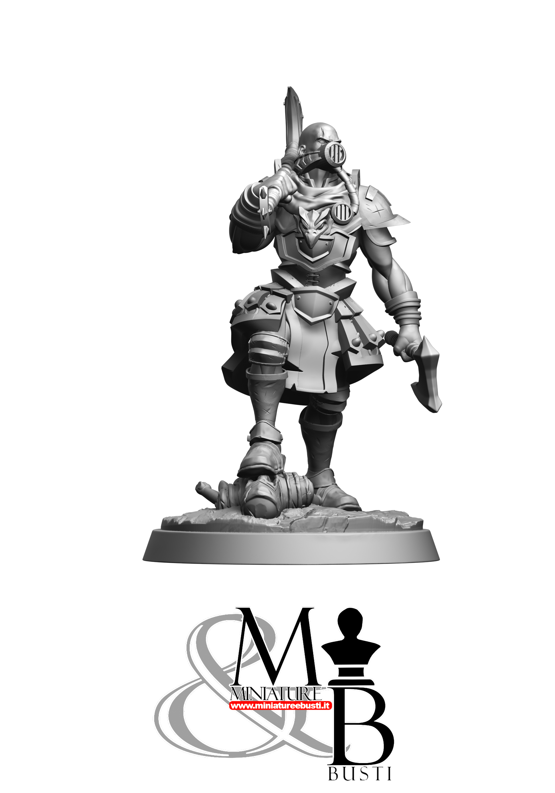 Questa è una MINIATURA. Le miniatura sono modelli pensati per i giochi di ruolo, ad esempio dungeons & Dragons, che poi ridimensioniamo in alto o in basso per le differenti scale. Di solito sono originariamente scolpiti per sistemi a 32mm (dove un uomo standard è alto 32mm dai piedi alla testa). Le proporzioni sono pensate tenendo in considerazione che verranno maneggiate spesso, quindi dettagli come spade e scudi sono particolarmente spessi. La miniatura viene venduta come appare nell'immagine, e dato che alcuni autori non aggiungono una base, se questa è assente nell'immagine significa che non verrà fornita con la miniatura.