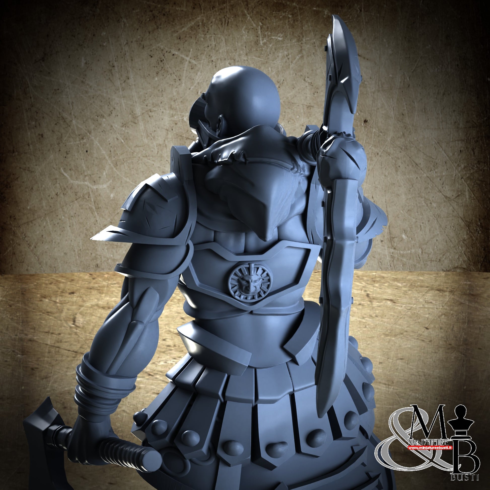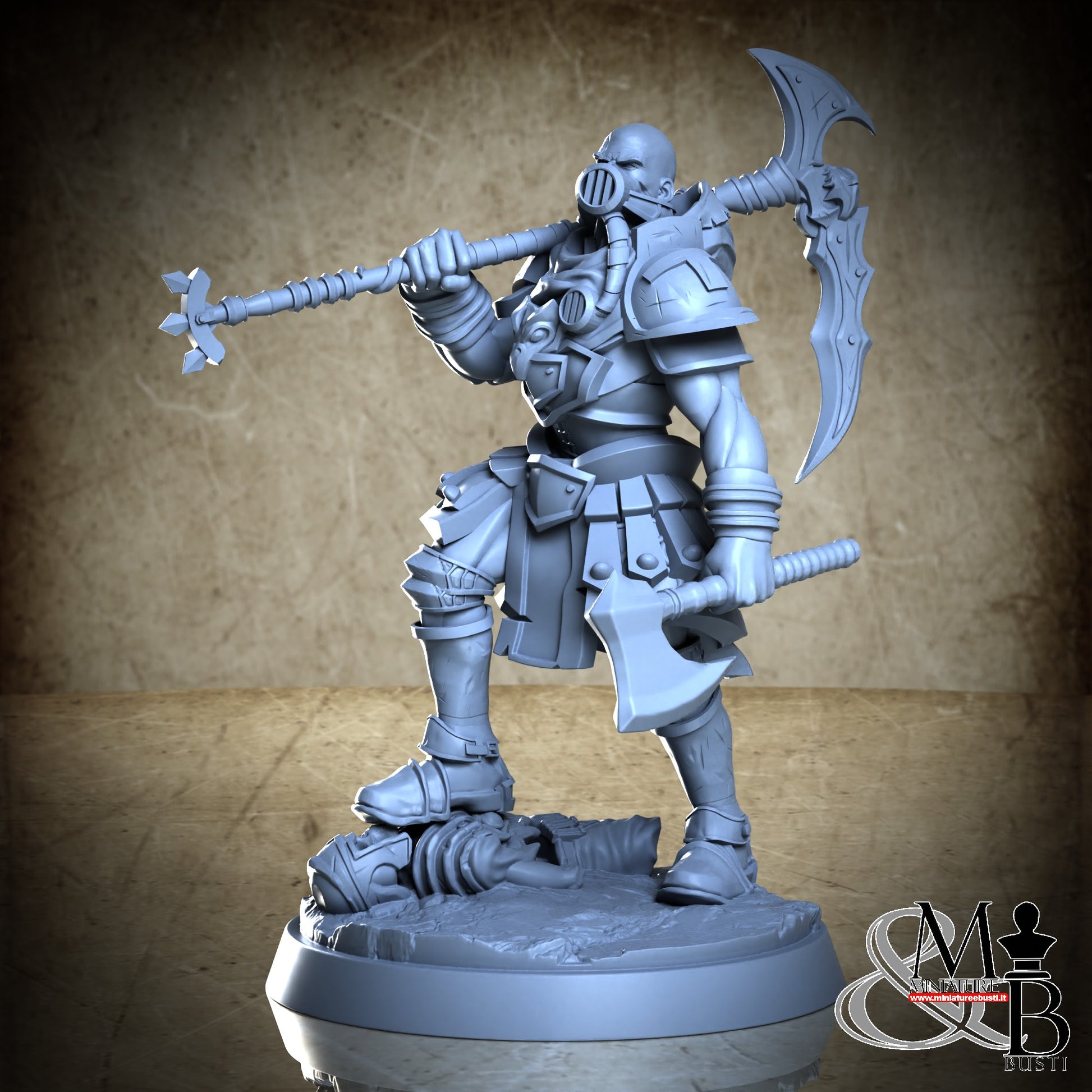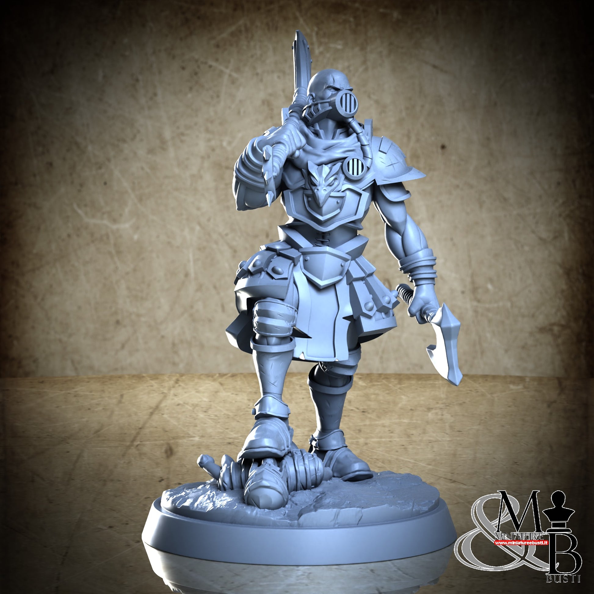 Questa è una MINIATURA. Le miniatura sono modelli pensati per i giochi di ruolo, ad esempio dungeons & Dragons, che poi ridimensioniamo in alto o in basso per le differenti scale. Di solito sono originariamente scolpiti per sistemi a 32mm (dove un uomo standard è alto 32mm dai piedi alla testa). Le proporzioni sono pensate tenendo in considerazione che verranno maneggiate spesso, quindi dettagli come spade e scudi sono particolarmente spessi. La miniatura viene venduta come appare nell'immagine, e dato che alcuni autori non aggiungono una base, se questa è assente nell'immagine significa che non verrà fornita con la miniatura.