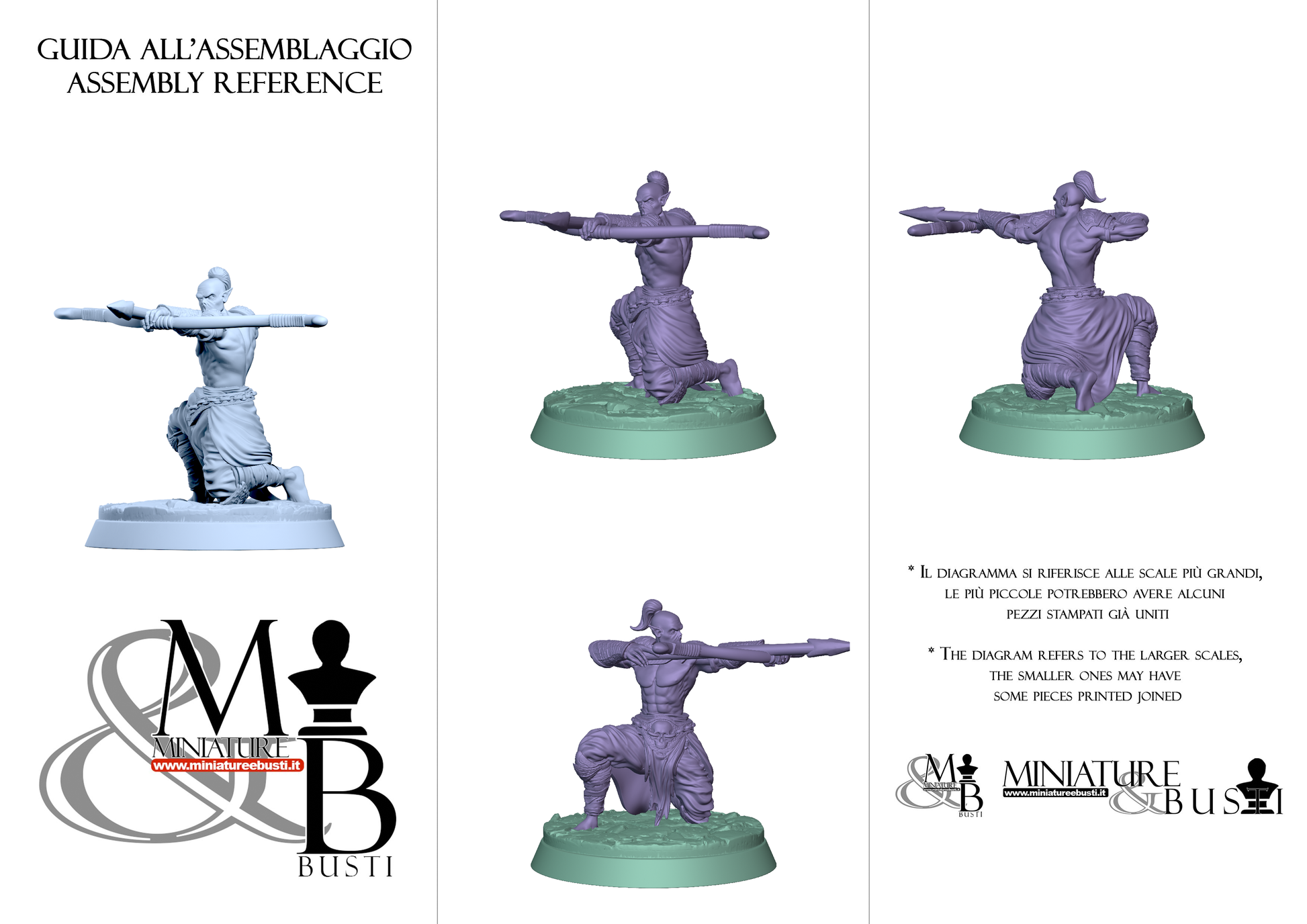 Questa è una MINIATURA. Le miniatura sono modelli pensati per i giochi di ruolo, ad esempio dungeons & Dragons, che poi ridimensioniamo in alto o in basso per le differenti scale. Di solito sono originariamente scolpiti per sistemi a 32mm (dove un uomo standard è alto 32mm dai piedi alla testa). Le proporzioni sono pensate tenendo in considerazione che verranno maneggiate spesso, quindi dettagli come spade e scudi sono particolarmente spessi. La miniatura viene venduta come appare nell'immagine, e dato che alcuni autori non aggiungono una base, se questa è assente nell'immagine significa che non verrà fornita con la miniatura.