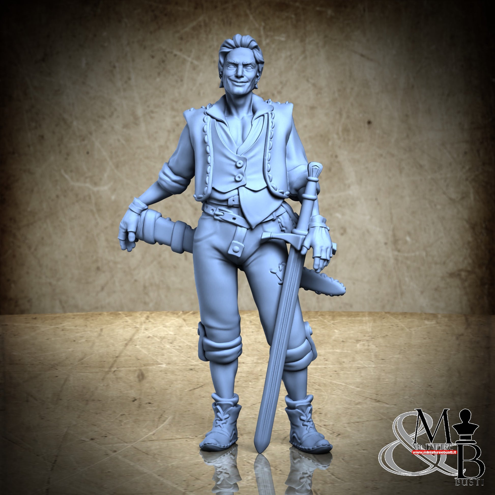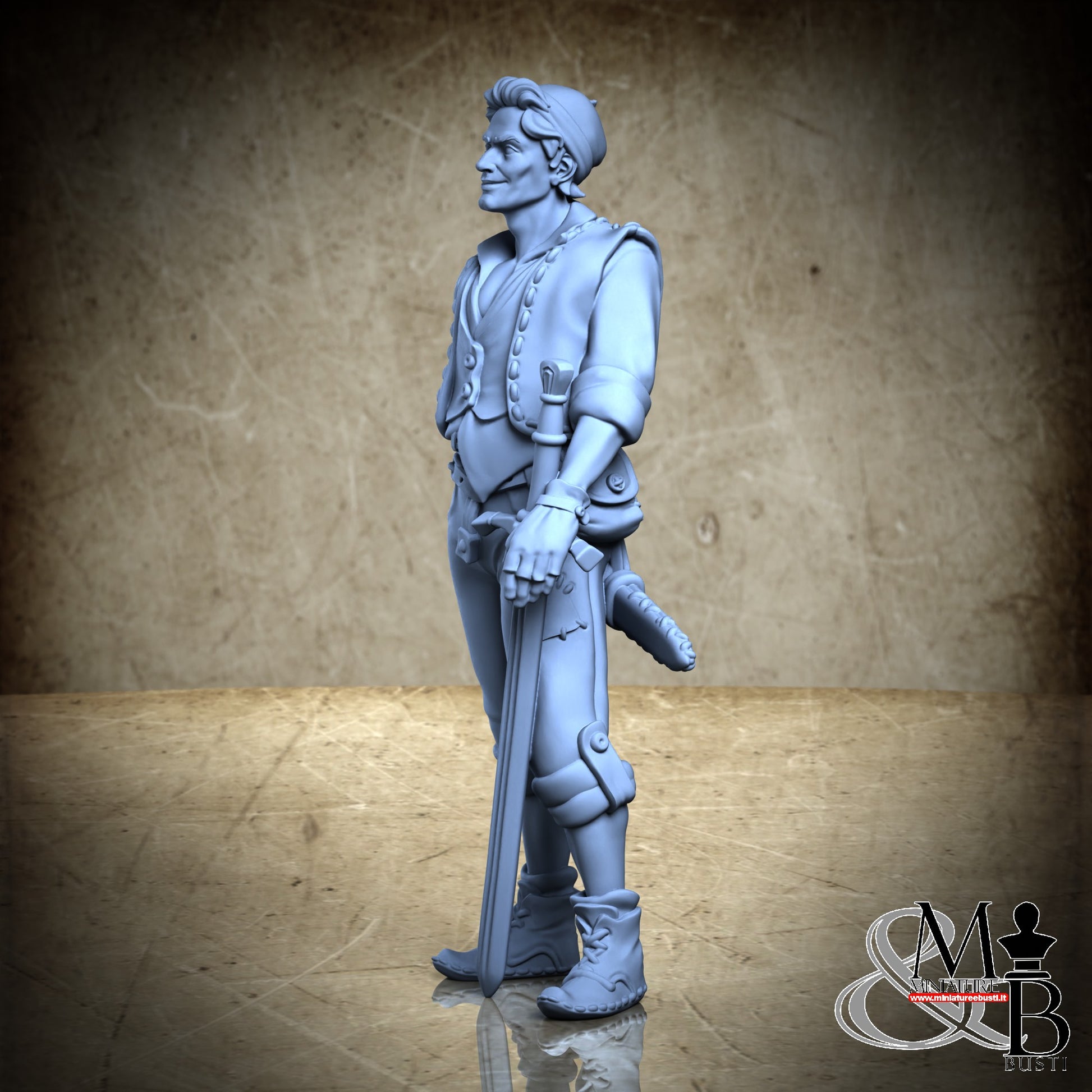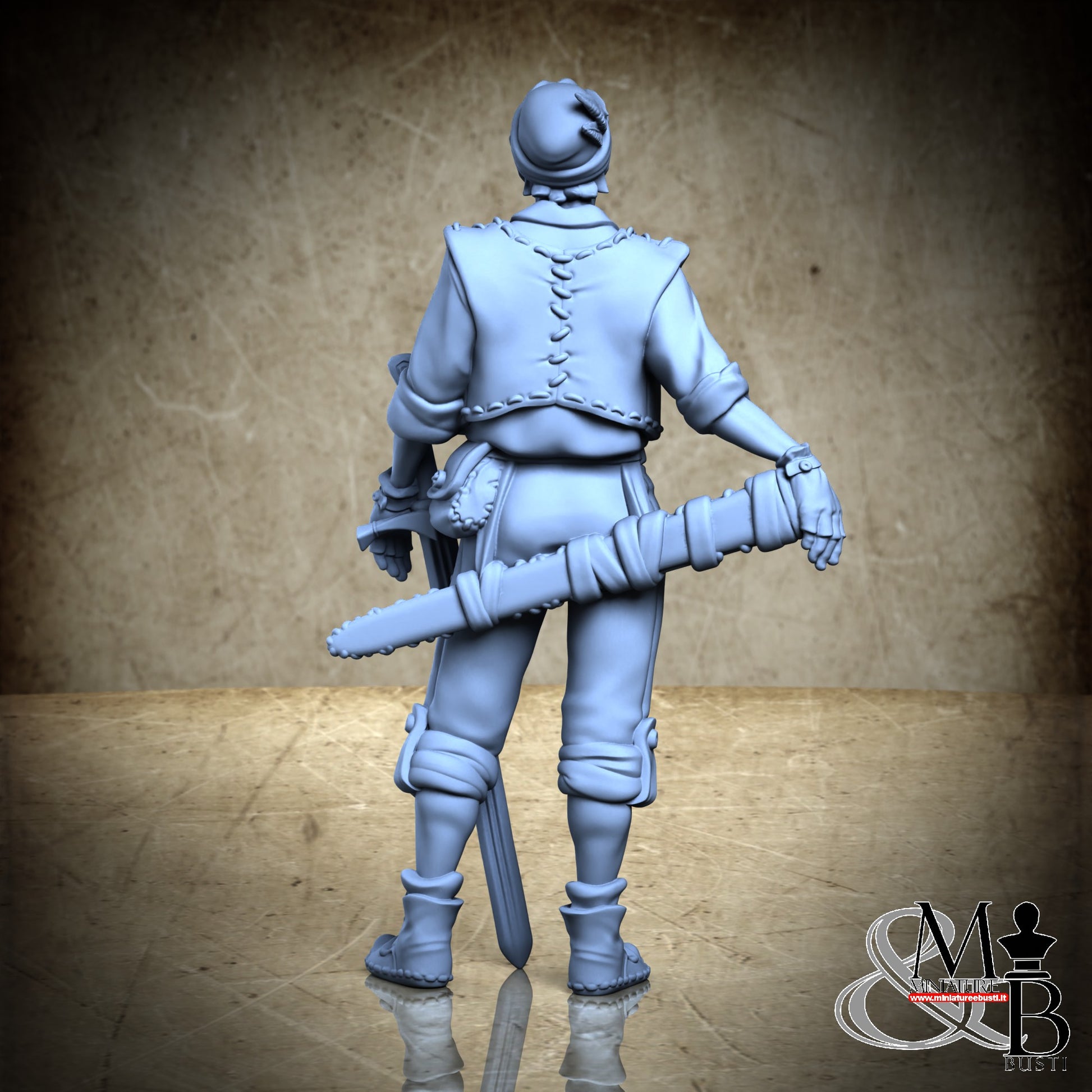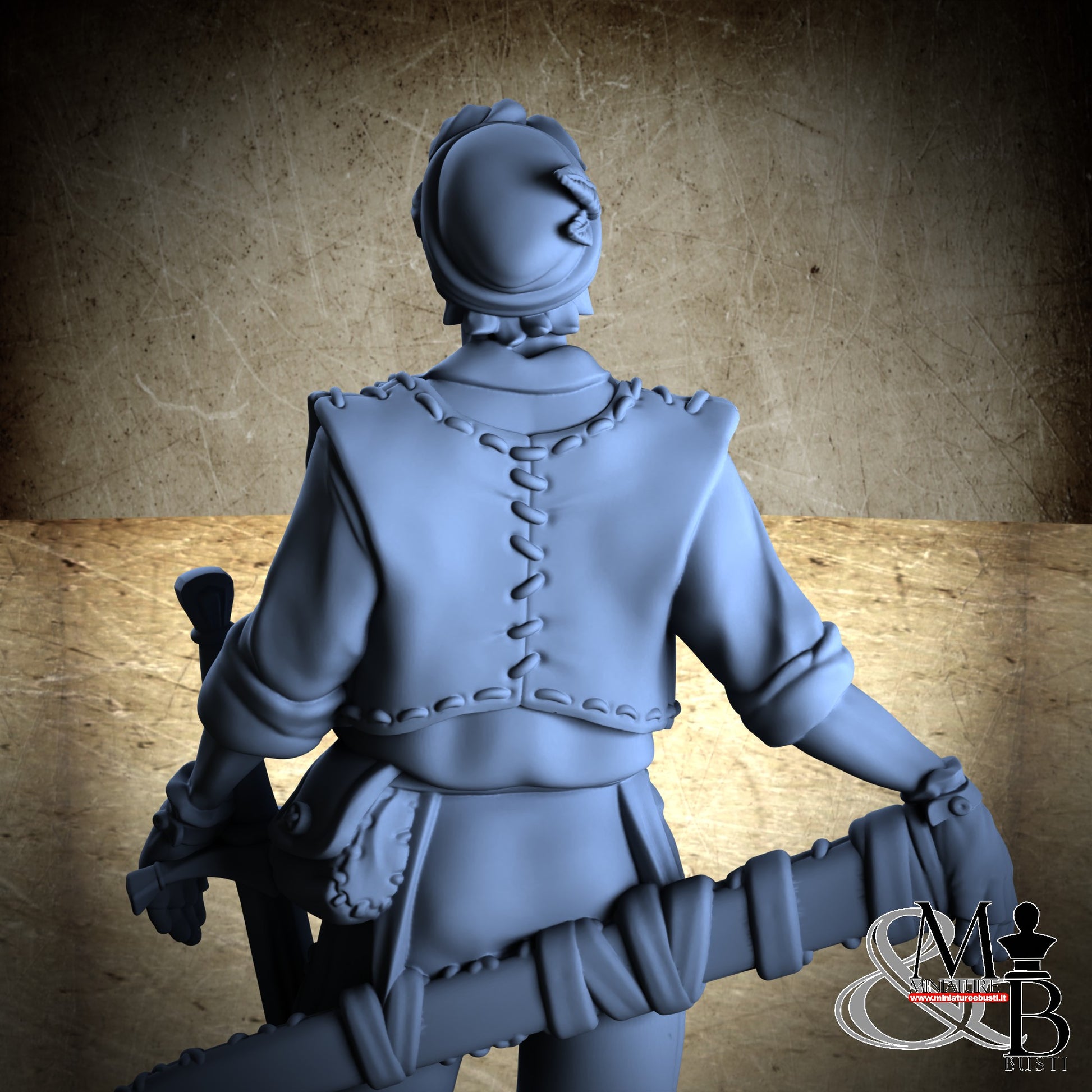 Questa è una MINIATURA. Le miniatura sono modelli pensati per i giochi di ruolo, ad esempio dungeons & Dragons, che poi ridimensioniamo in alto o in basso per le differenti scale. Di solito sono originariamente scolpiti per sistemi a 32mm (dove un uomo standard è alto 32mm dai piedi alla testa). Le proporzioni sono pensate tenendo in considerazione che verranno maneggiate spesso, quindi dettagli come spade e scudi sono particolarmente spessi. La miniatura viene venduta come appare nell'immagine, e dato che alcuni autori non aggiungono una base, se questa è assente nell'immagine significa che non verrà fornita con la miniatura.