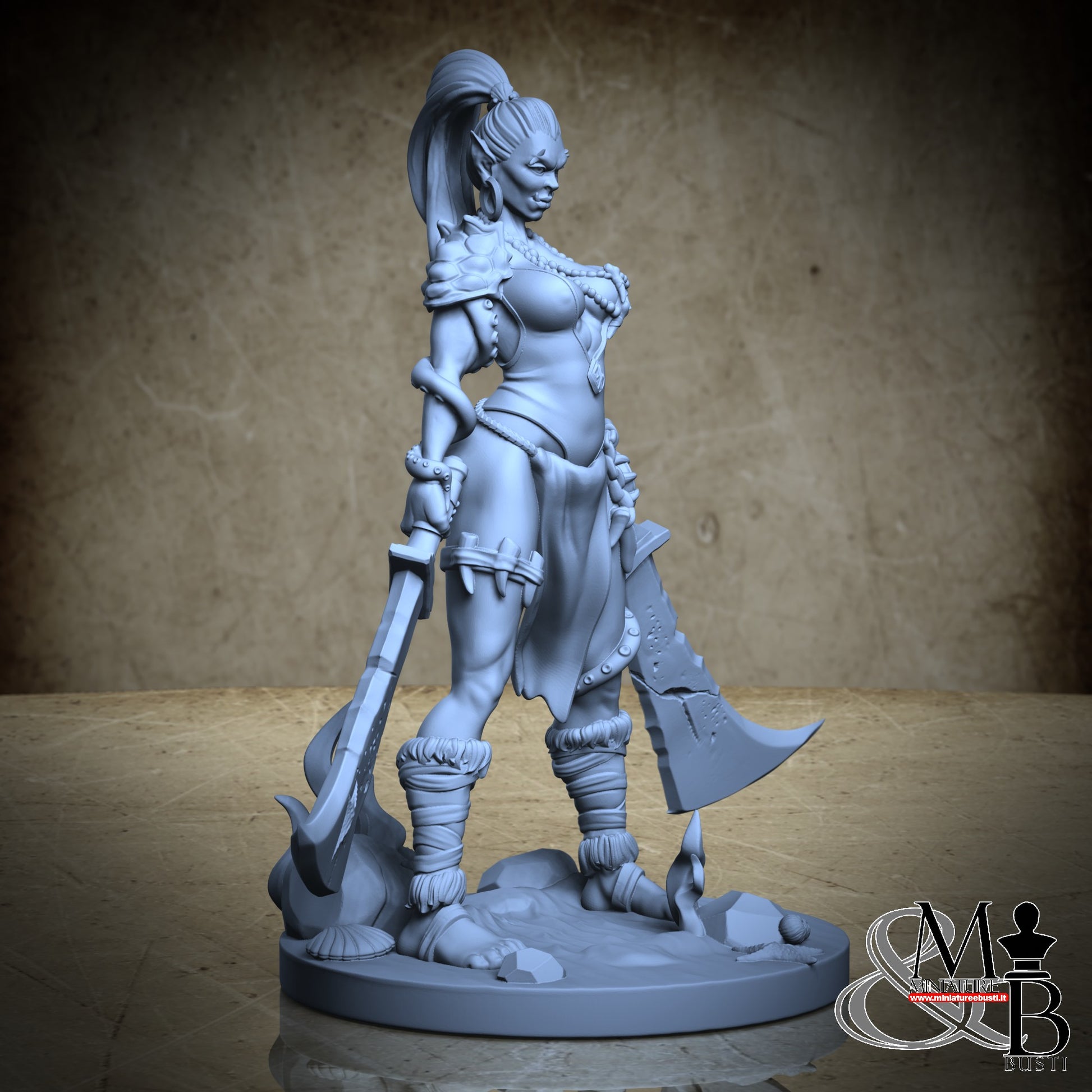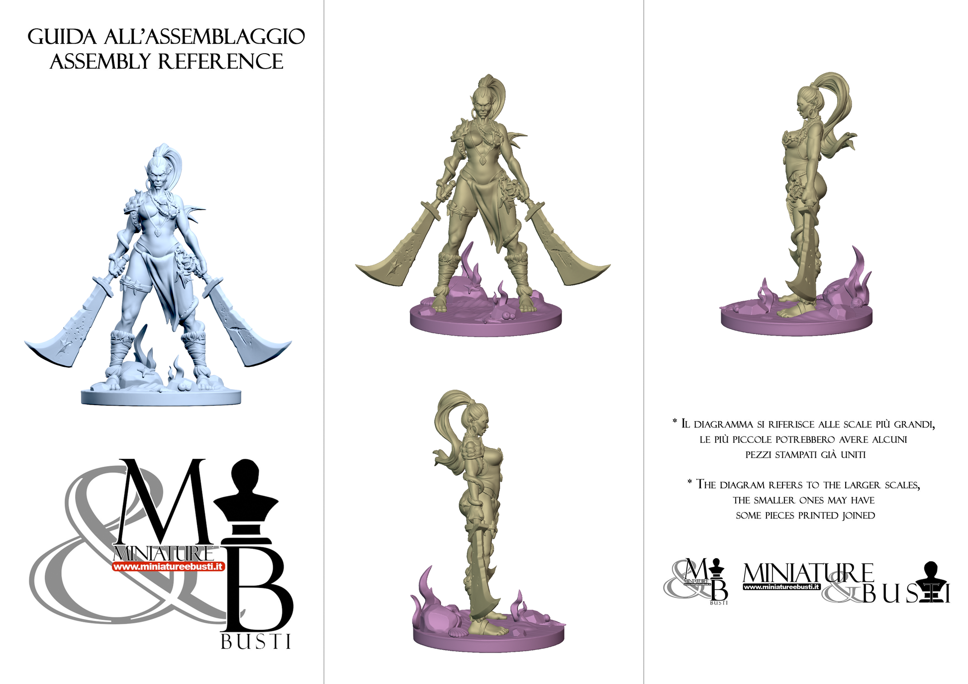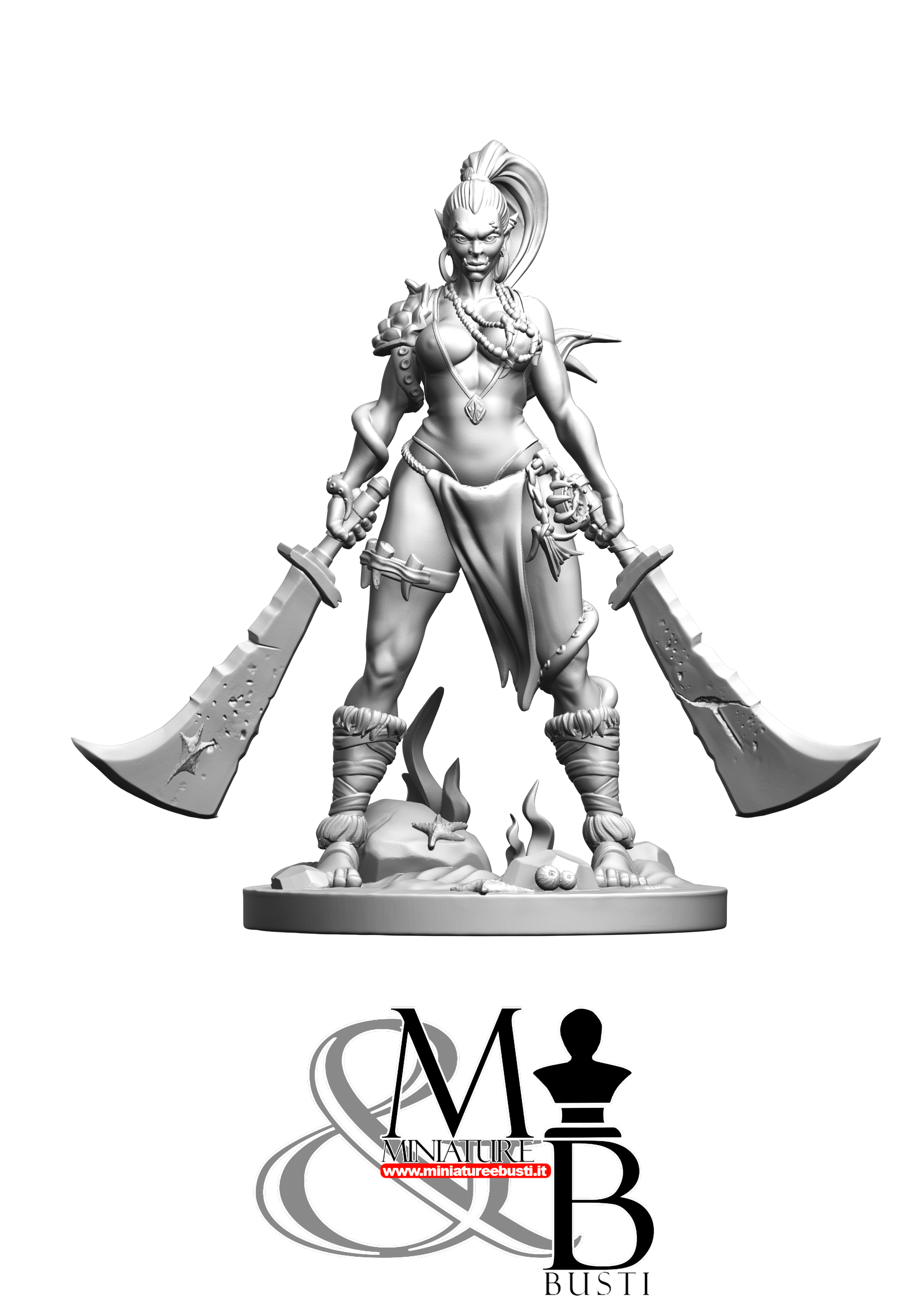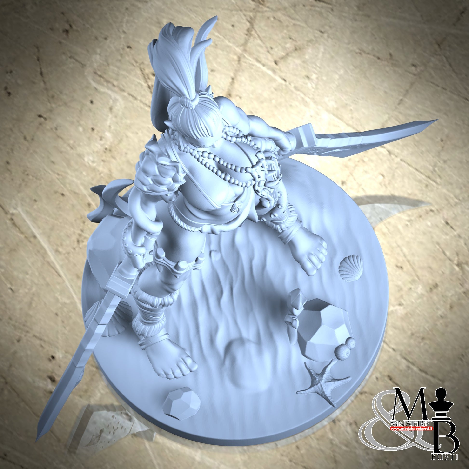 Questa è una MINIATURA. Le miniatura sono modelli pensati per i giochi di ruolo, ad esempio dungeons & Dragons, che poi ridimensioniamo in alto o in basso per le differenti scale. Di solito sono originariamente scolpiti per sistemi a 32mm (dove un uomo standard è alto 32mm dai piedi alla testa). Le proporzioni sono pensate tenendo in considerazione che verranno maneggiate spesso, quindi dettagli come spade e scudi sono particolarmente spessi. La miniatura viene venduta come appare nell'immagine, e dato che alcuni autori non aggiungono una base, se questa è assente nell'immagine significa che non verrà fornita con la miniatura.