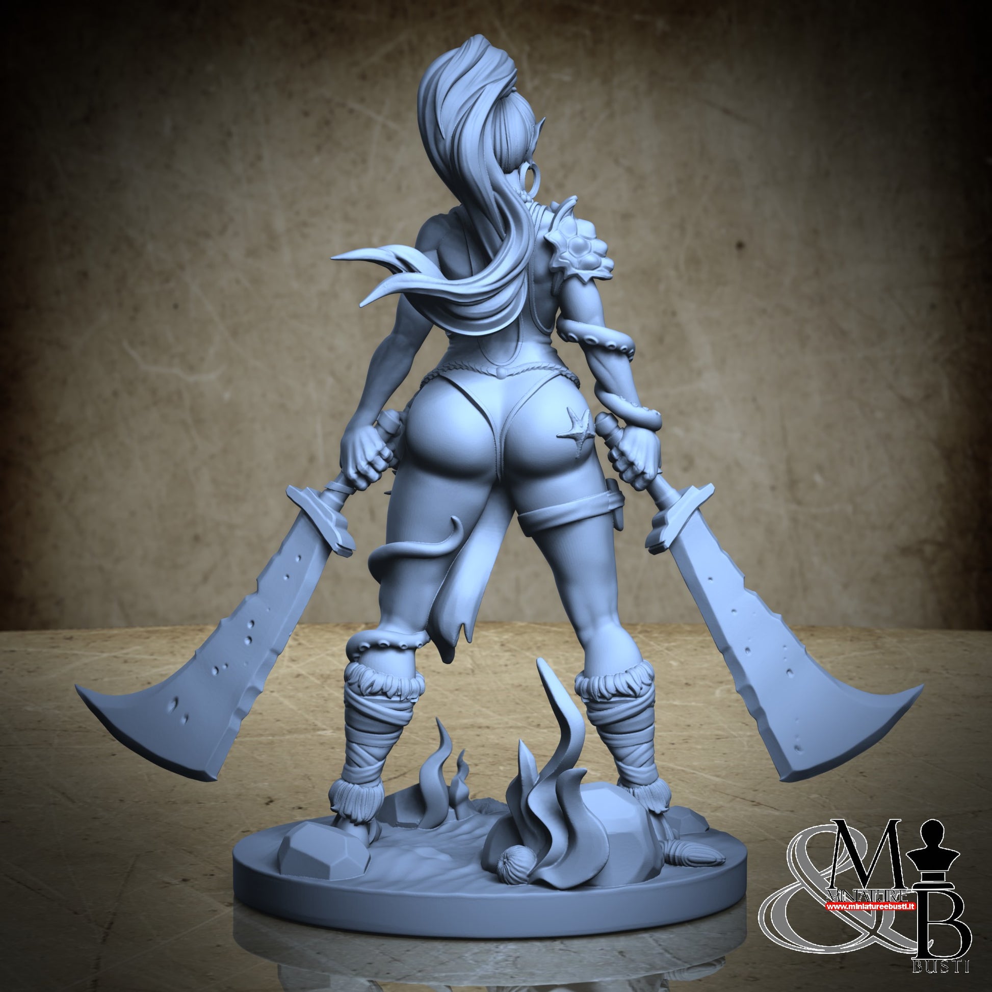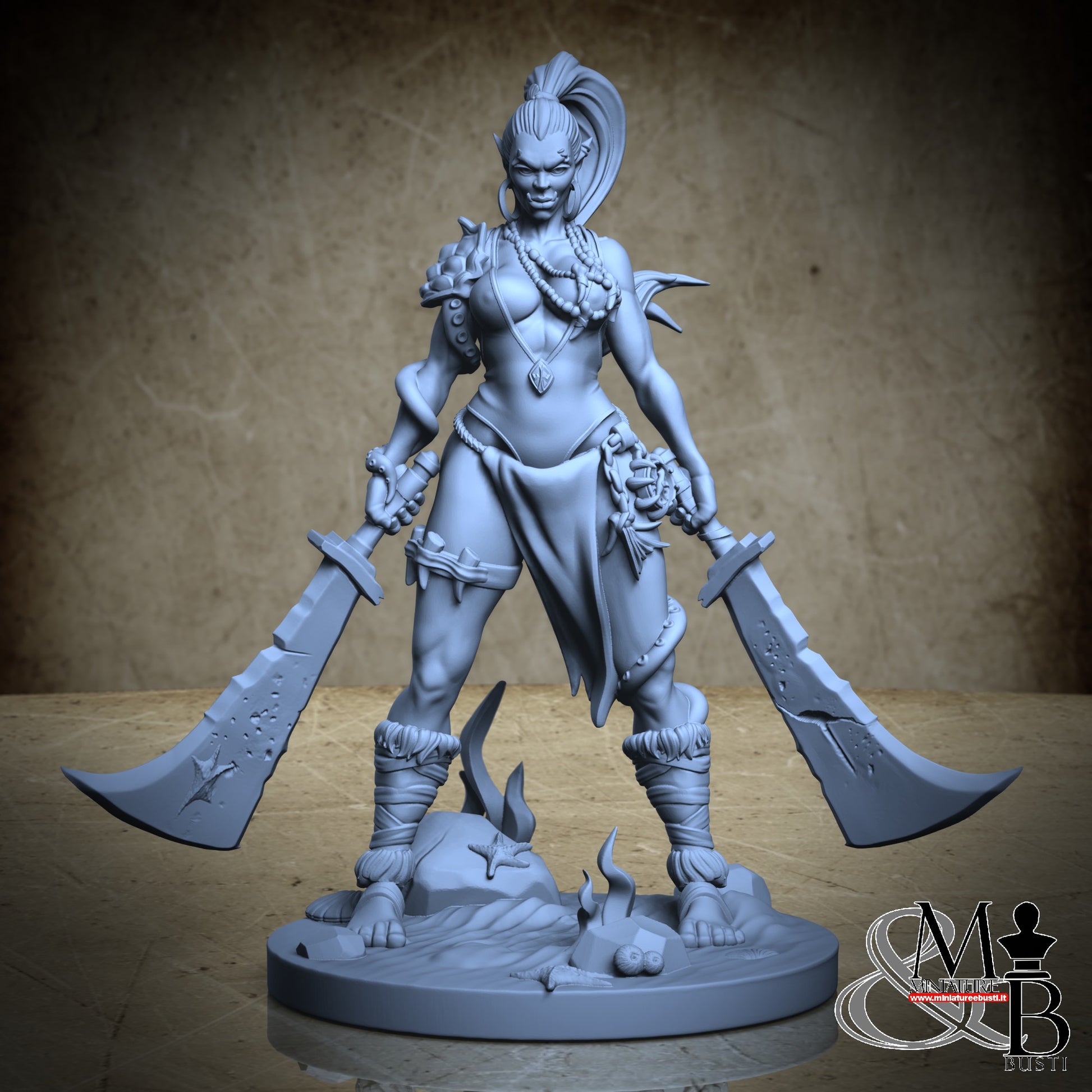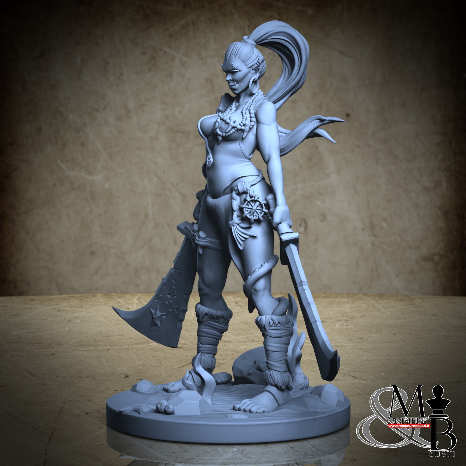 Questa è una MINIATURA. Le miniatura sono modelli pensati per i giochi di ruolo, ad esempio dungeons & Dragons, che poi ridimensioniamo in alto o in basso per le differenti scale. Di solito sono originariamente scolpiti per sistemi a 32mm (dove un uomo standard è alto 32mm dai piedi alla testa). Le proporzioni sono pensate tenendo in considerazione che verranno maneggiate spesso, quindi dettagli come spade e scudi sono particolarmente spessi. La miniatura viene venduta come appare nell'immagine, e dato che alcuni autori non aggiungono una base, se questa è assente nell'immagine significa che non verrà fornita con la miniatura.