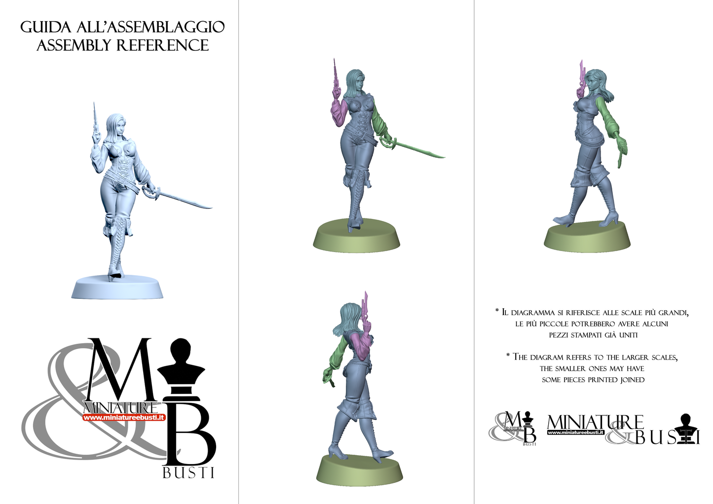 Questa è una MINIATURA. Le miniatura sono modelli pensati per i giochi di ruolo, ad esempio dungeons & Dragons, che poi ridimensioniamo in alto o in basso per le differenti scale. Di solito sono originariamente scolpiti per sistemi a 32mm (dove un uomo standard è alto 32mm dai piedi alla testa). Le proporzioni sono pensate tenendo in considerazione che verranno maneggiate spesso, quindi dettagli come spade e scudi sono particolarmente spessi. La miniatura viene venduta come appare nell'immagine, e dato che alcuni autori non aggiungono una base, se questa è assente nell'immagine significa che non verrà fornita con la miniatura.